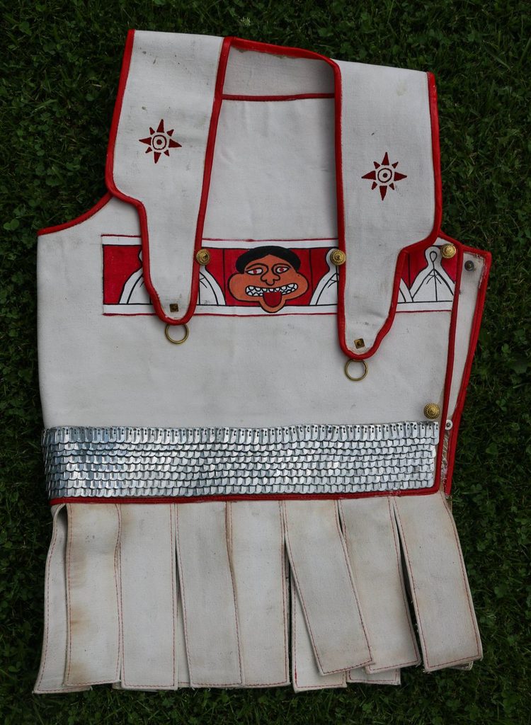 Linothorax is an upper body armour worn by the Ancient Greeks made of linen glued in layers with animal fat. This linen Cuirass is associated with Alexander The Great. It has an etched metal plate at the waist giving it a more ornamental look. This cuirass is fully wearable and can be used for costume dressing or reenactment purposes.