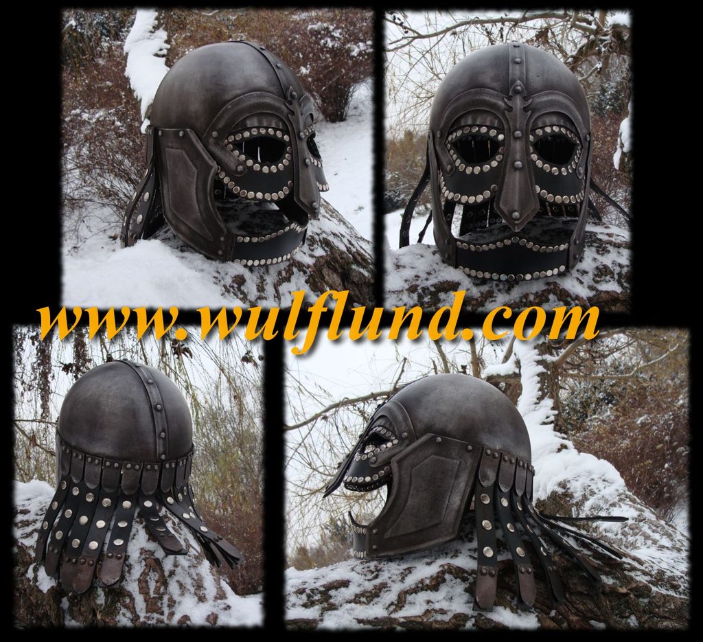 Fantasy iron helmet made in viking style with patina. Helmet includes leather parts with studs. Suitable as metalwear for heavy metal fans or performers.