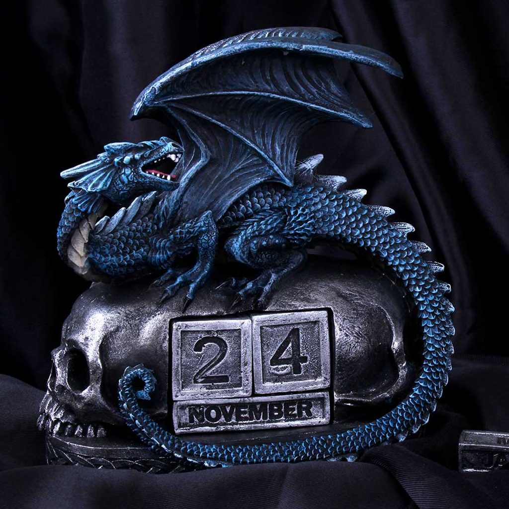 On two silver-toned skulls rests a majestic blue dragon. Its body is rendered in a subtle shade of blue, its tail winds gracefully over the skulls and reaches down to the base of the calendar. The dragon's wings are outstretched, standing guard with its mouth open, giving a hint of hidden fire and reminding us that time and space leave nothing unattended.