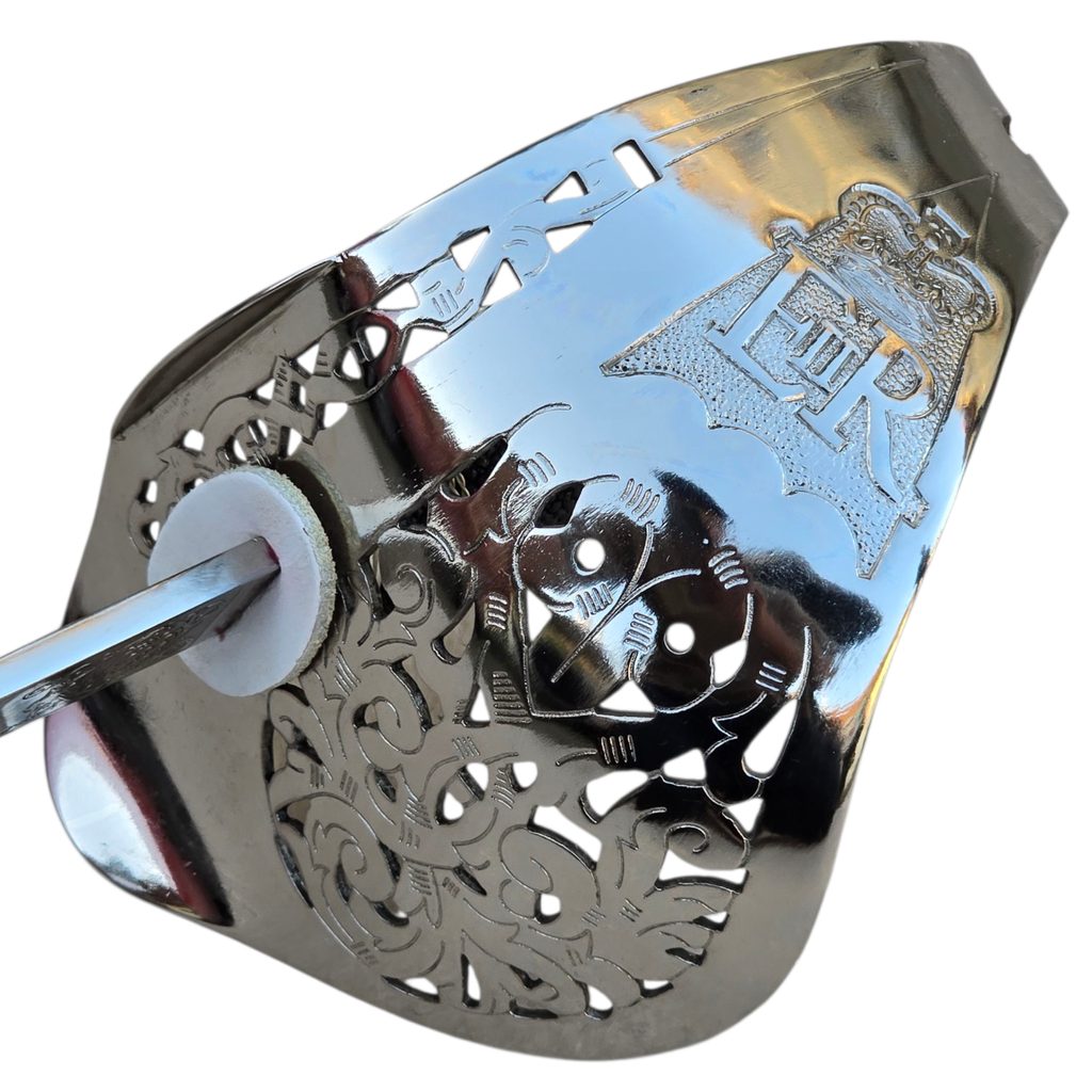 This replica of the British 1897 Infantry Officer’s Sword features a blade forged from tempered 1055 high carbon steel. The blade is richly engraved on both sides with decorative filigree and royal military motifs.