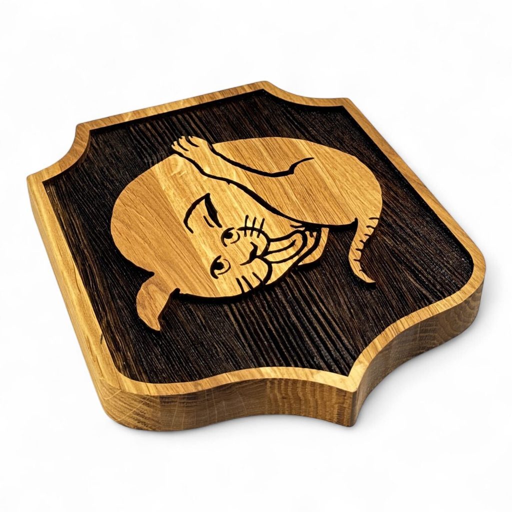 A wooden wall decoration in the shape of a signboard with the Kingdom Come logo : Deliverance 2 is made of oak wood. The motif is embossed, the wood is burnt to a depth of about 3-4mm. Due to the different hardness of the winter and summer wood fibers, the firing process results in a unique texture that is original on each piece. A hook is attached on the other side for hanging on the wall.