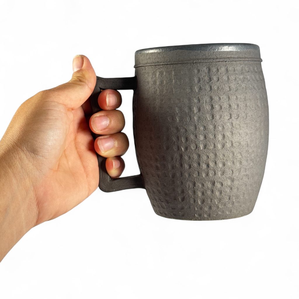 Replica of a medieval cup from the 14th century. According to the findings of Sezimovo Ústí, south Bohemia. Volume: 500 ml. Height: 12.5 cm. Burning in an outdoor wood-burning oven. Also suitable for hot drinks.