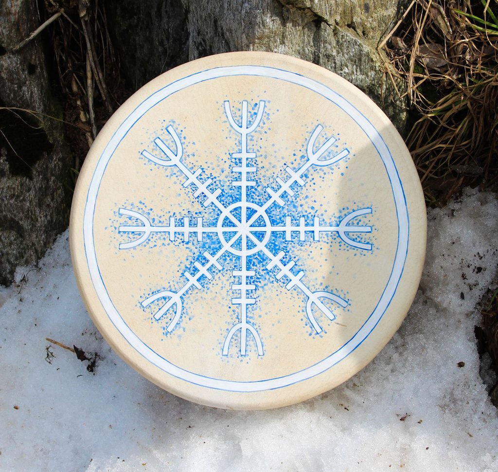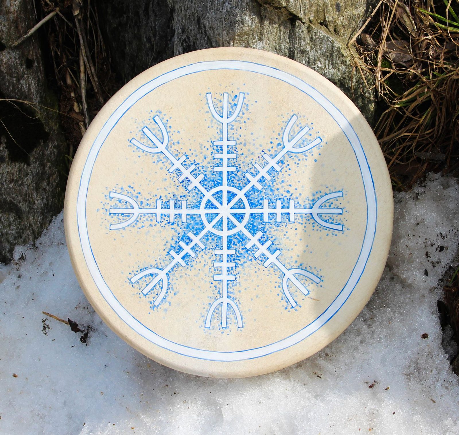 A handpainted shamanic frame drum. It is decorated with the Ægishjálmur (Helm of Awe or Helm of Terror) symbol, one of the Icelandic magical staves. It is believed to possess powerful qualities of protection against evil or injustice. It was used by warriors to induce fear in their enemies’ hearts and to prevail in battle.