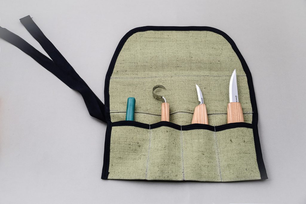 This perfect set contains sloyd knife, chip carving knife, hook knife, leather strop with polishing compound.