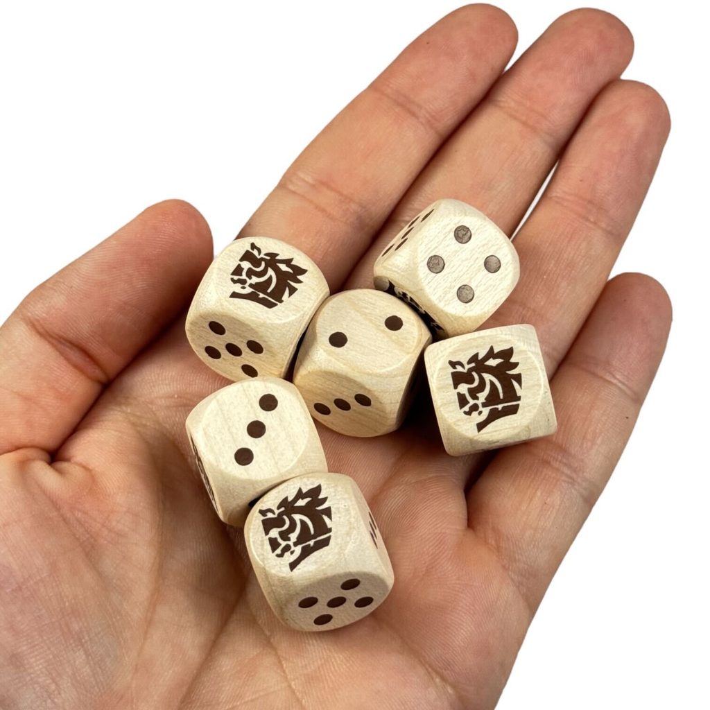 The cup with lid is handmade from premium smooth cowhide. The set includes six wooden dice engraved with the Warhorse Studios logo.