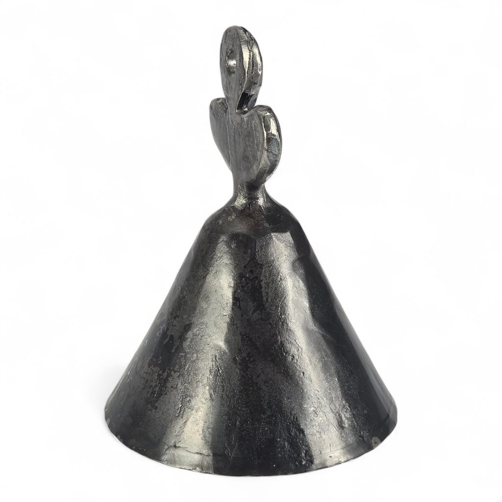 Hand forged bell made of steel with angel motif. The simple and solid design is complemented by a decorative silhouette of an angel, which forms the upper part of the bell and also serves as a handle.