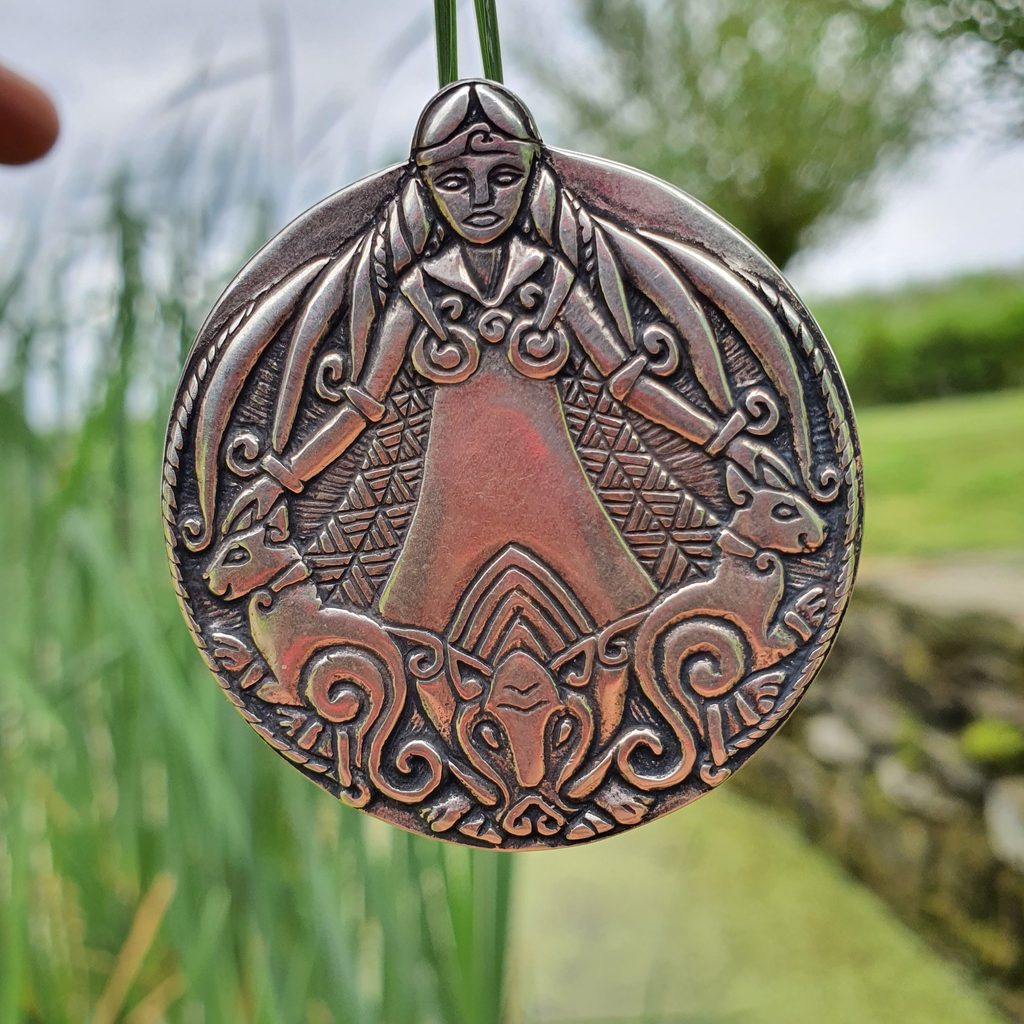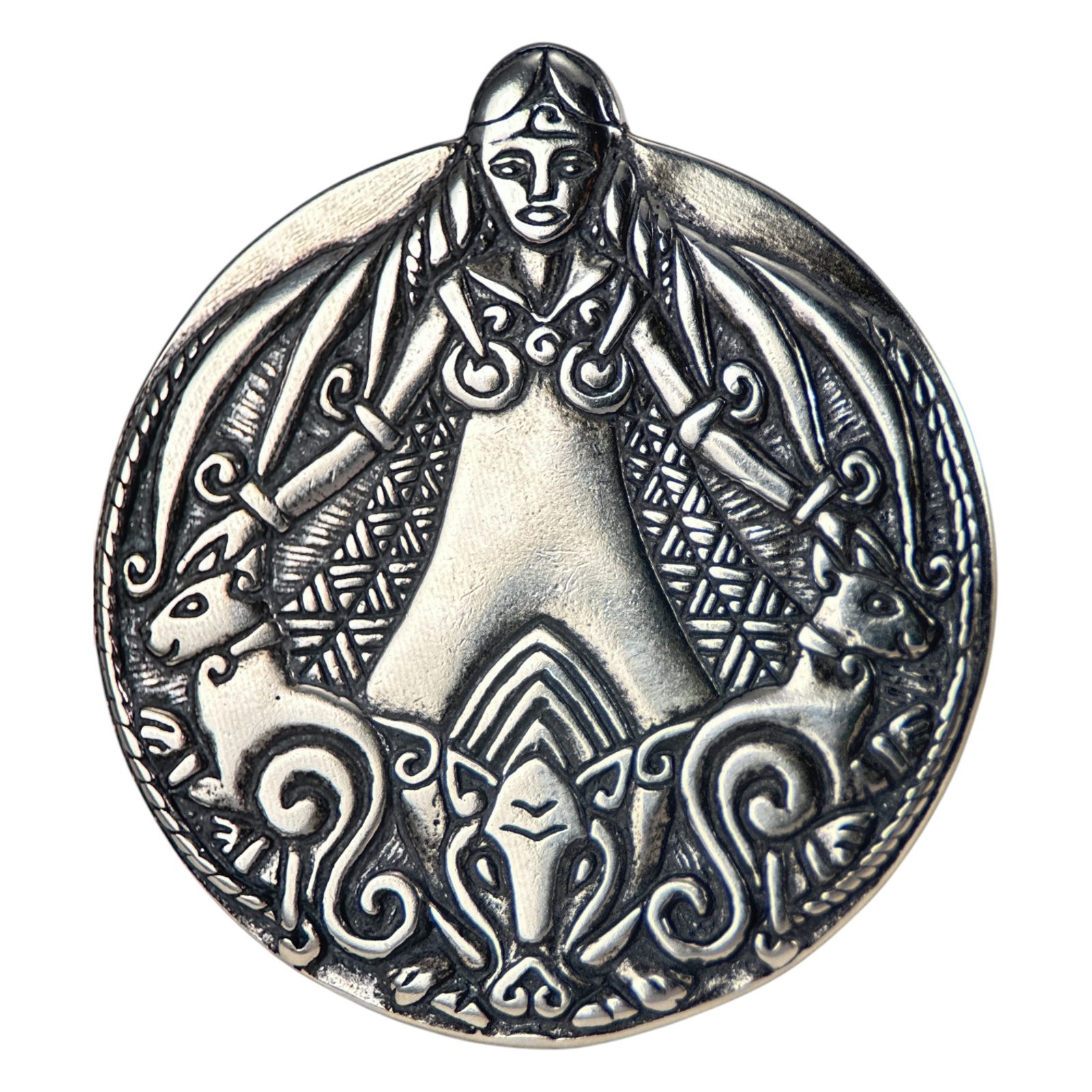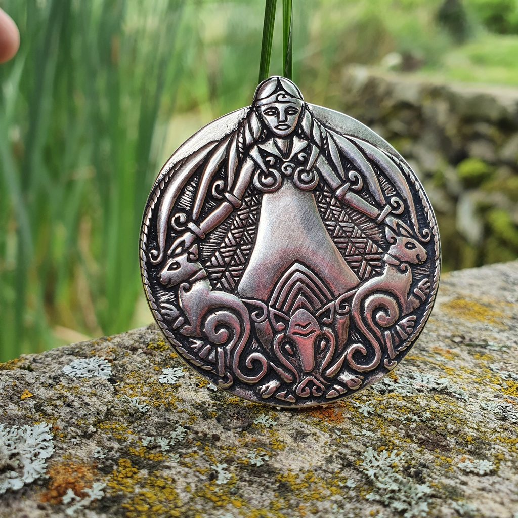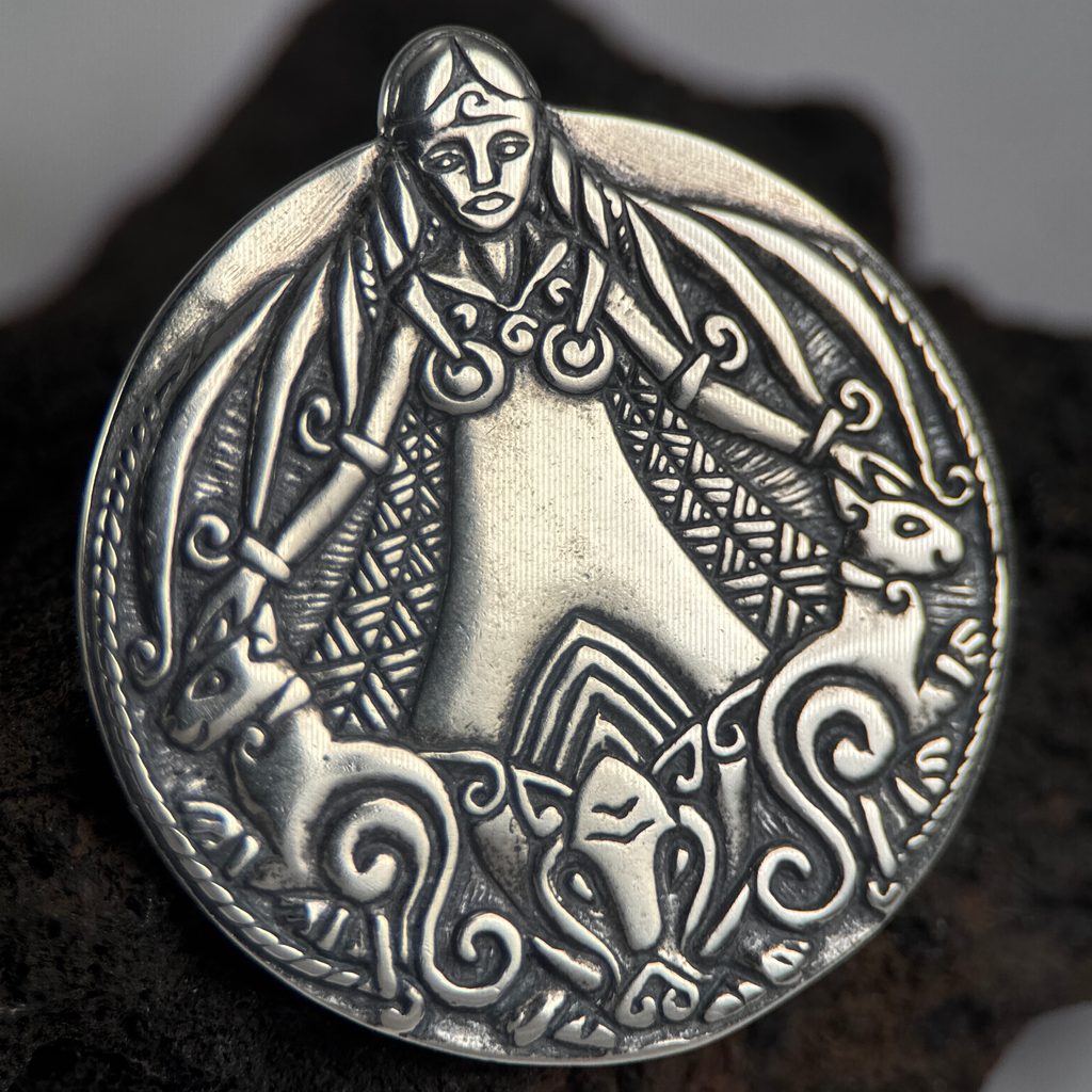 In Norse mythology, Freyja is a Goddess associated with love, beauty, fertility, sex, war, gold, and seiðr. She owns the necklace Brísingamen, rides a chariot pulled by two cats, is accompanied by the boar Hildisvíni, and possesses a cloak of falcon feathers.