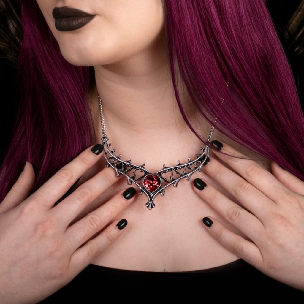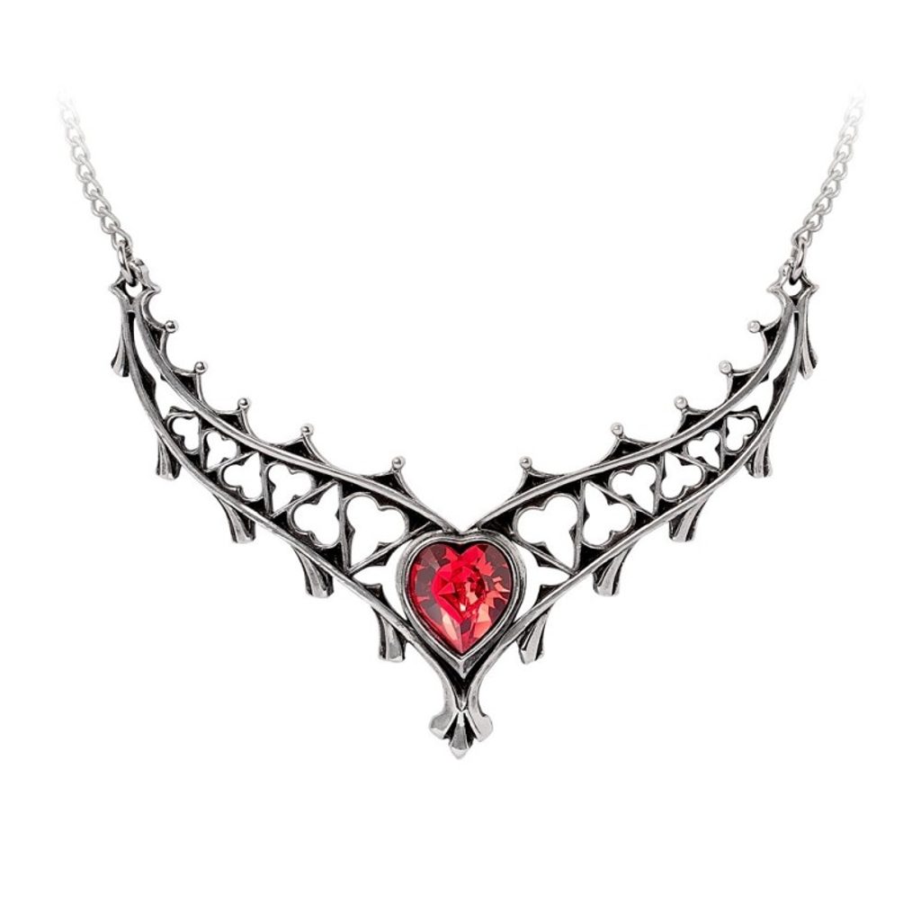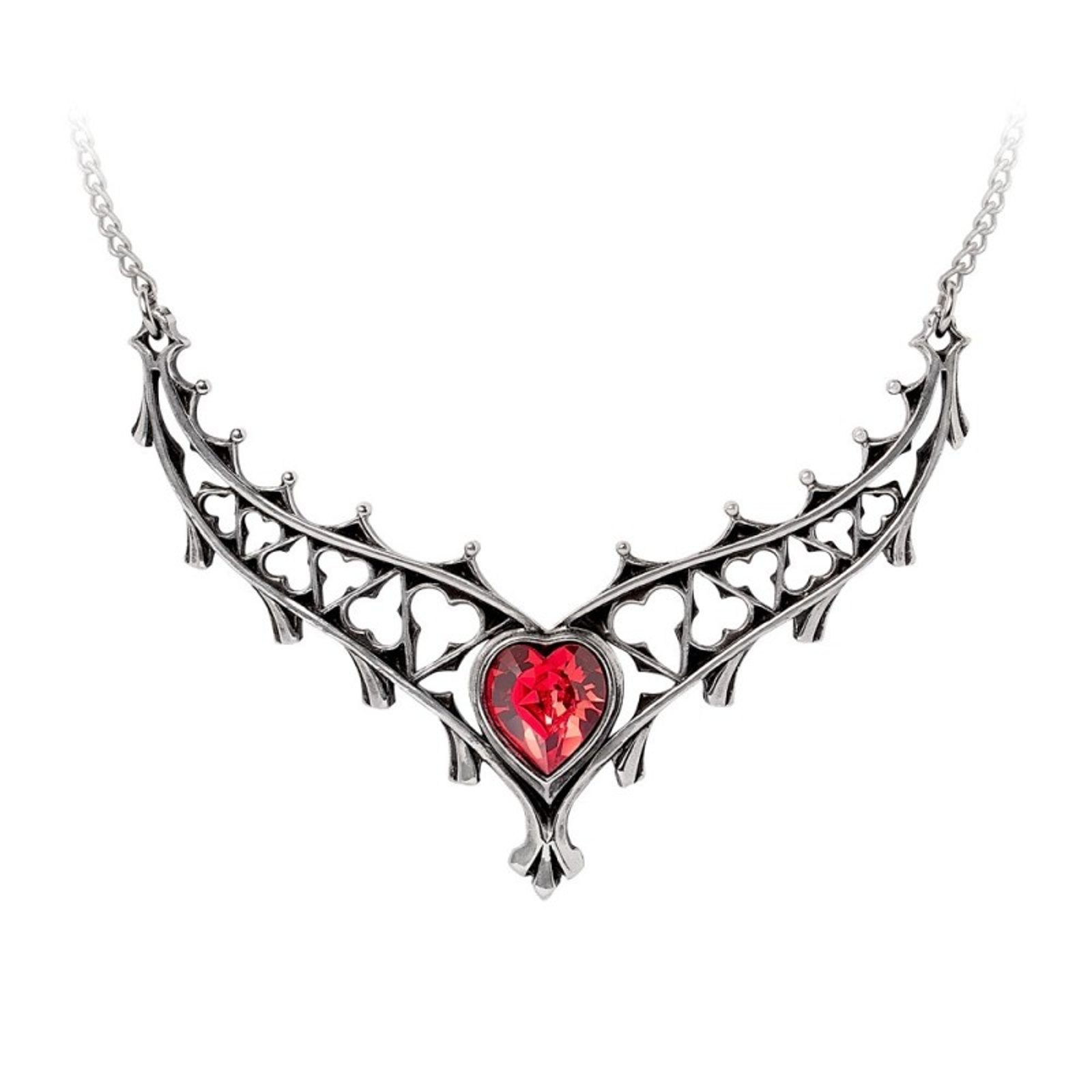 The Elizabethannecklace is a breathtaking piece of jewellery combining gothic romance and royal beauty. Handcrafted from high quality English pewter and carefully polished to a brilliant shine. It is decorated with delicate heart-shaped cut-outs framed by a striking red Austrian heart-shaped crystal . Suspended from a chain, it looks opulent and unforgettable - like the Tudor court itself.