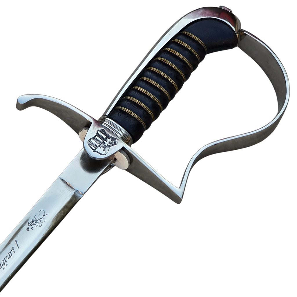 This Hungarian infantry saber has a blade of tempered, unsharpened EN9 high carbon steel. The blade is etched with the inscription “Ne bantsd a magyart!”, which translates to “Do not harm the Hungarian!” – a patriotic motto that appeared on Hungarian weapons in the 19th century.