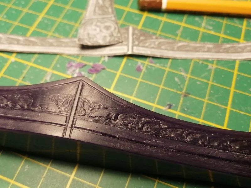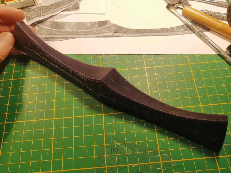 We chose to hand-carve the pommel and guard by engraving into wax - something that 3D printing simply cannot match in quality. Every detail had to be exact, and after a month of delicate wax engraving, the work was completed. This was followed by the equally demanding process of molding the models and then casting them in bronze using the traditional lost-wax method. It should be noted that the entire project - whether we could produce Radzig’s swords true to their in-game design - depended above all on this stage. The pommel design is based on an actual historical find. Since the in-game sword features a silver finish on both pommel and guard, we also applied silver plating and patination.