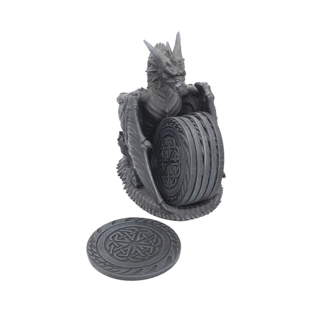 This stylish coaster set from gothic masters Nemesis Now will be perfect for any alternative home! A black dragon sits on the back, on a stone floor. His wings are stretched forward to form a cradle for the coasters, while his head is raised to watch over his realm. Hand-painted before being encased in the finest resin, this piece is a great addition to any creepy home.