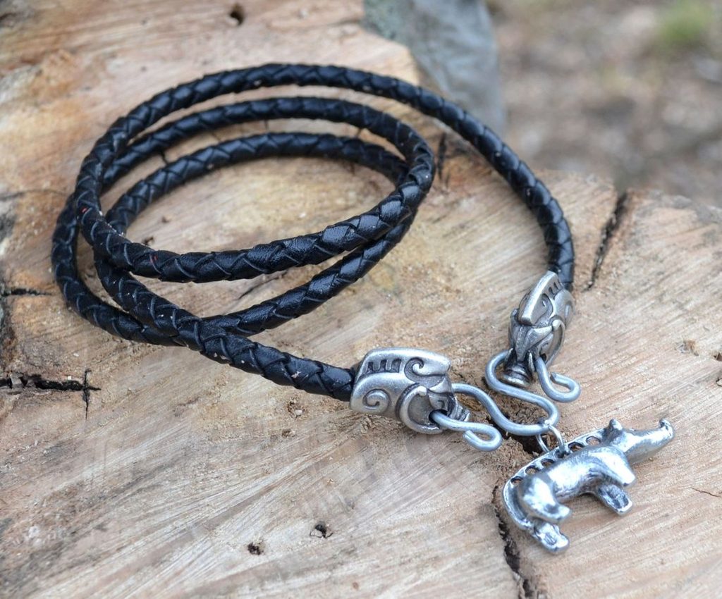CELTIC BOAR Necklace with Leather Bolo Replica. The Boar Pendant is a replicka of a boar figure found in Tabor, Bohemia, the Czech Rep, from the period of La Tene culture. Leather bolo with boar head terminals are included.
