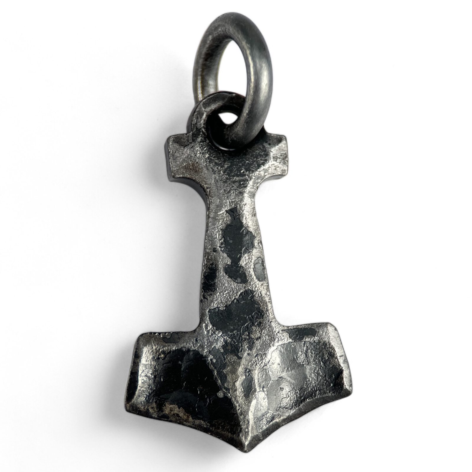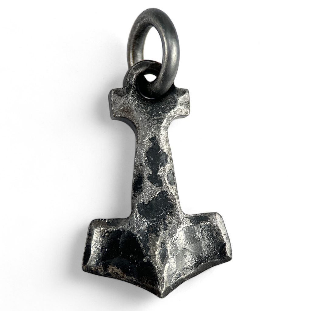 A massive pendant inspired by the legendary Mjölnir, the hammer of the thunder god Thor. A symbol of strength, courage and protection, worn as a talisman by the Norse as far back as Viking times. This piece is hand forged from steel, with the surface left in an authentic blacksmith's look - so each hammer bears a unique texture.