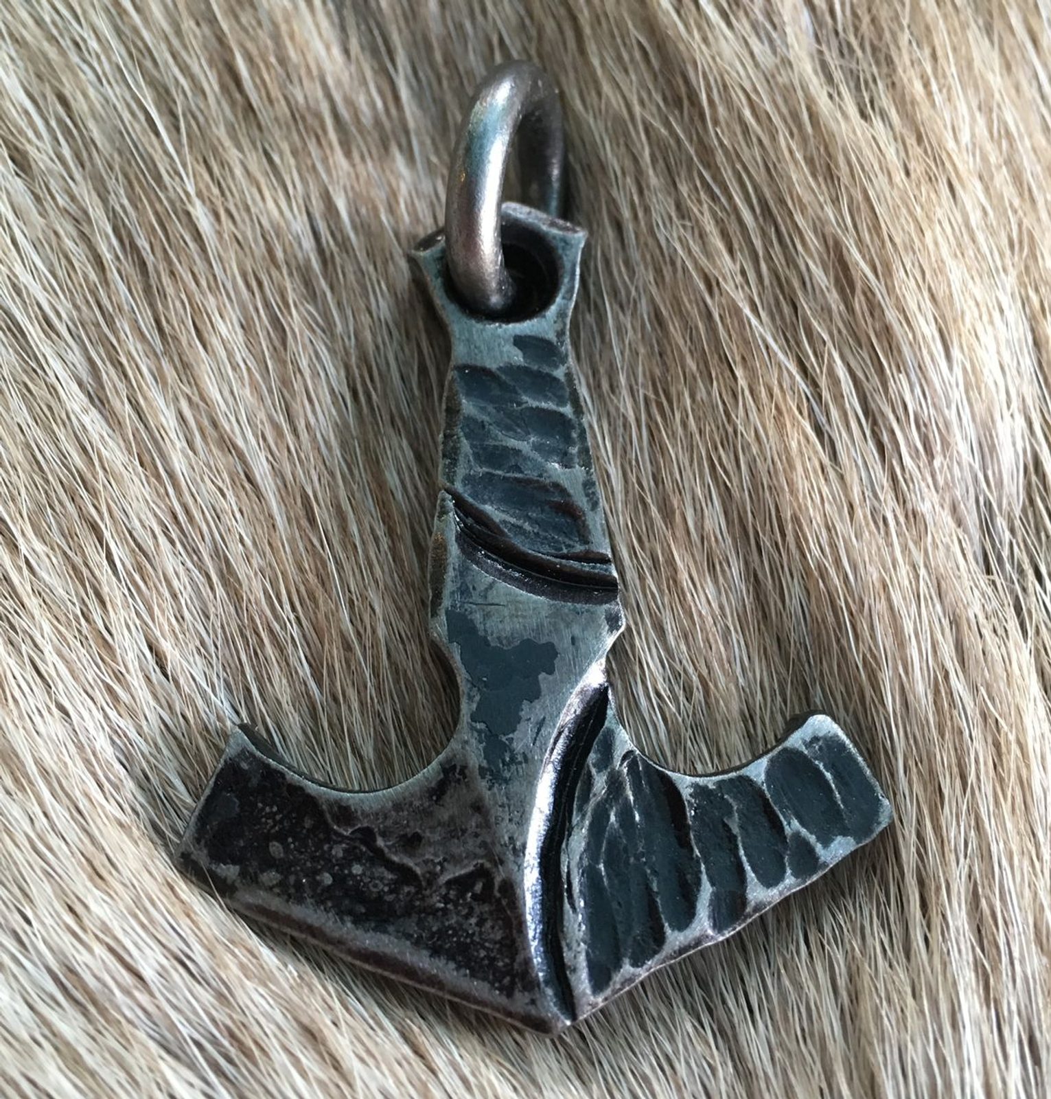 The pendant is hand forged from steel and measures 3,5 × 4,5 cm. The surface is deliberately left with visible hammer strike marks, which give it character. The eyelet with a diameter of 5 mm allows for comfortable hanging. With a weight of 15 g, it feels pleasantly sturdy but is not heavy to carry.