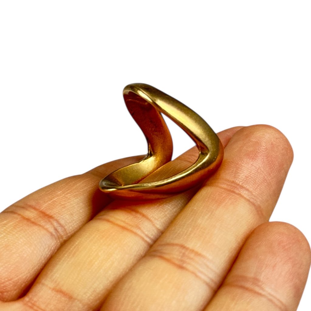 Its shape makes the ring look unobtrusive on the hand, even though it is distinctly different from today's common rings. It fits most fingers except the thumb and can be an accessory for everyday wear and for those looking for a piece of jewellery with a story.