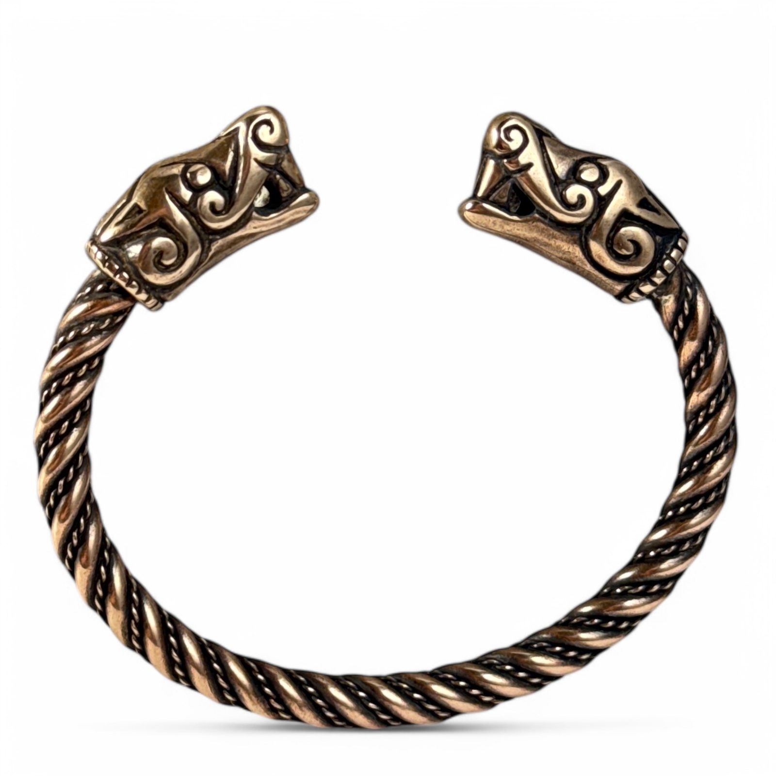 VIKING WOLF Bracelet inspired by a real archeological fiind on the isle of Gotland, Sweden, locality of Burg. The original was crafted by twisting metal rods of various widths and it features stylized wolf or dragon heads.