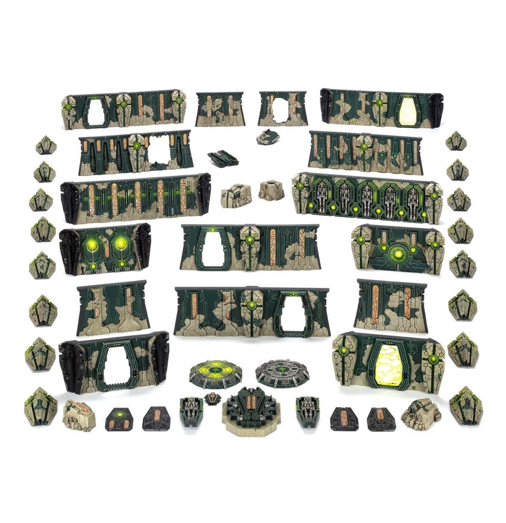 – Killzone: Tomb World: A double-sided folding game board, along with a set of 25x modular Tomb World terrain pieces consisting of pillars and walls, plus special pieces like a Necron sarcophagus and teleport pads.