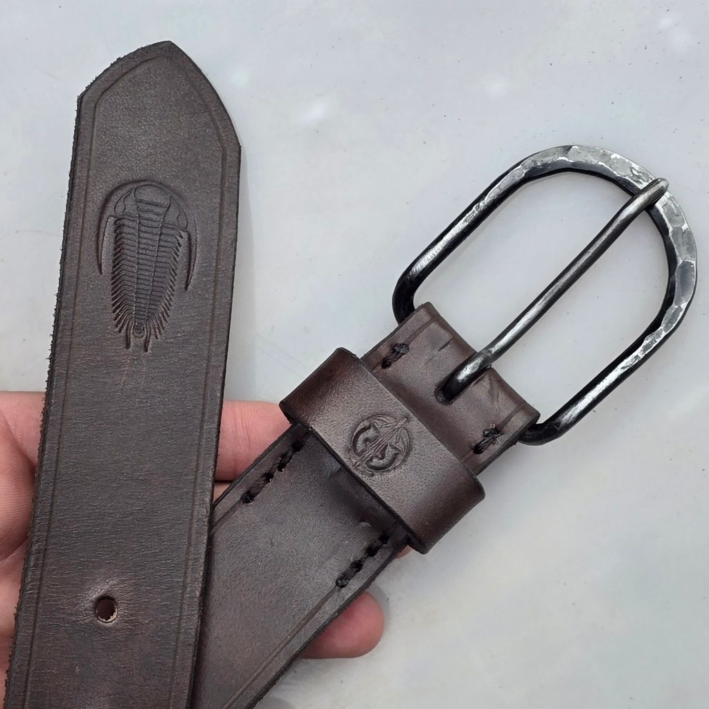 The belt buckle is hand-forged and measures 52 × 68 mm. The leather features an embossed trilobite motif. The belt has a vintage appearance and pays tribute to the pioneers of this fascinating natural science discipline.