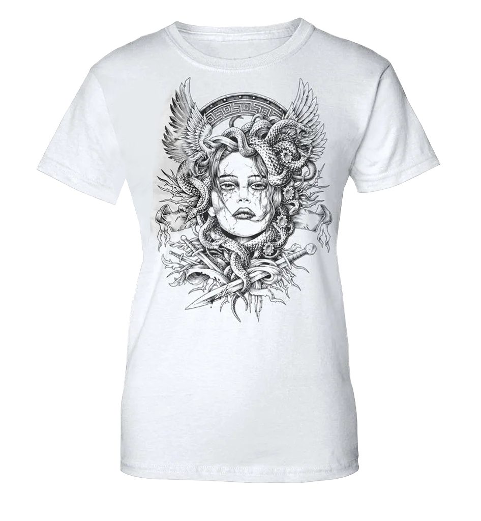 MEDUSA, t-shirt inspired by ancient Greek mythology. In Greek mythology, Medusa was a Gorgon, generally described as a winged human female with living venomous snakes in place of hair. Those who gazed upon her face would turn to stone.
