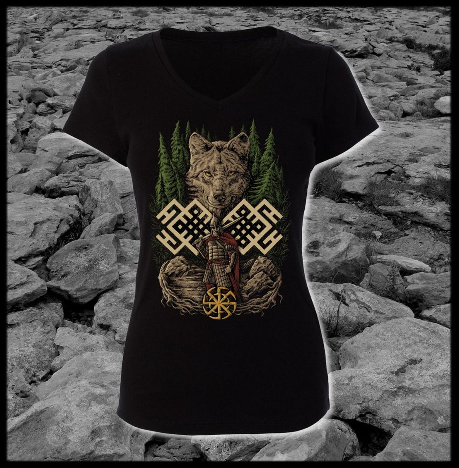WOLF WARRIOR Slavic LADIE'S T-shirt with Kolowrat Symbol. The Kolowrat (Kolovrat, Collowrath) symbol is in the Modern Age considered a panslavic pagan symbol of the Sun. The symbol can be found in architecture, on embroidery and pottery from the Early Slavic period in most Slavic countries. Its massive popularity today is the matter of the last century.