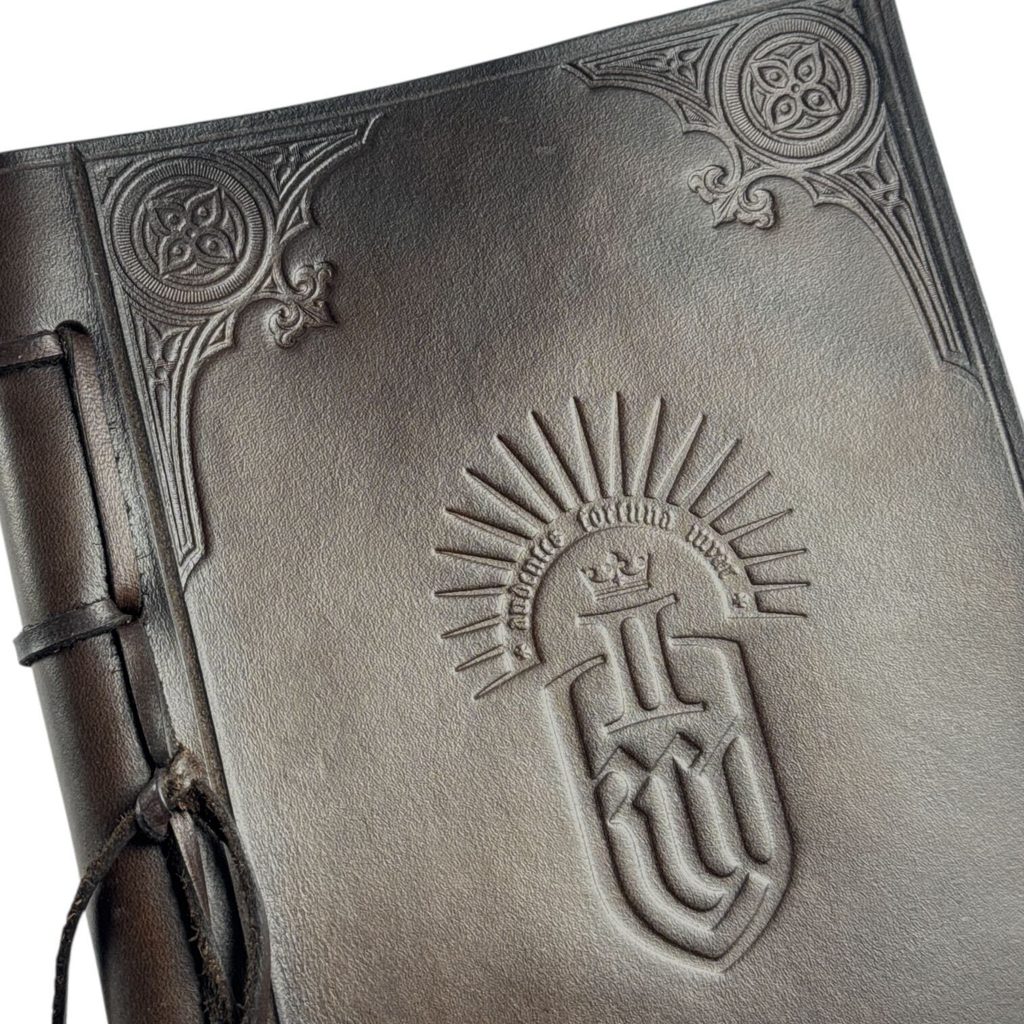 Notebook with a handcrafted, decorated leather cover embossed with the logo of the game Kingdom Come: Deliverance II. The corners of the leather cover are adorned with motifs from restored antique embossing stamps, which, after more than a hundred years, have found new use and come back to life.