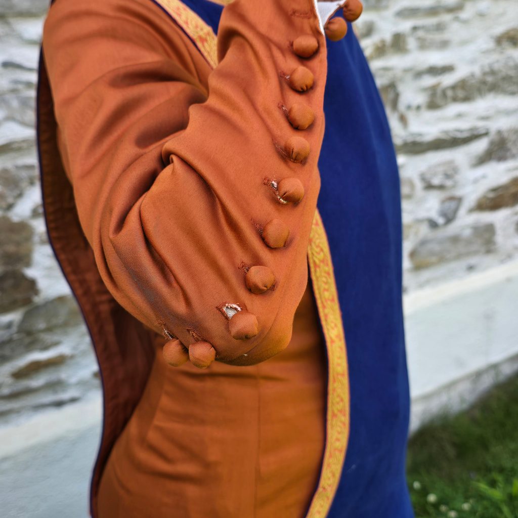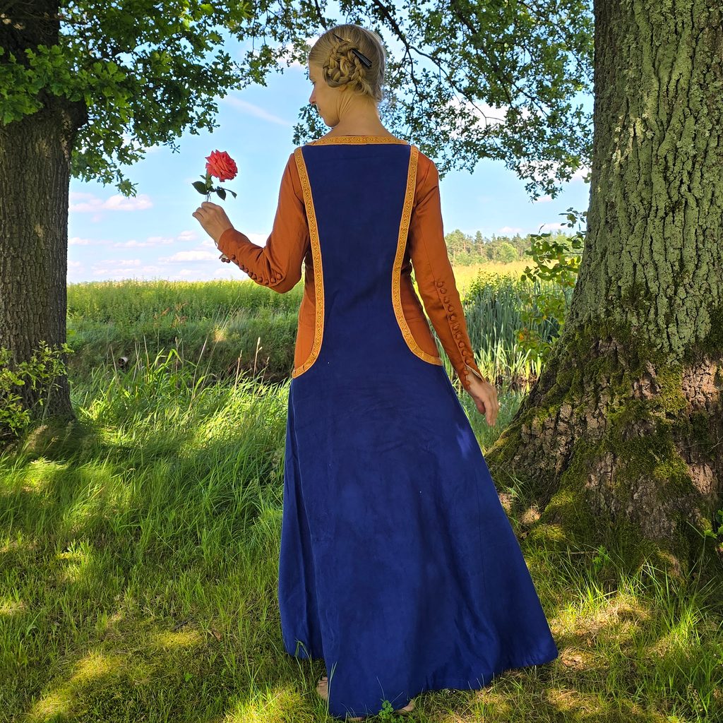 SLEEVELESS OVERGOWN, Surcotte, 2nd Half of the 14th Century – Dark blue color, with a pattern, velveteen (cotton), trim ribbon yellow with a floral pattern (cotton) – change possible upon individual arrangement.
