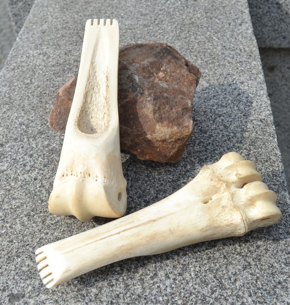 This bone scraper from domestic bison (Bos primigenius f. taurus) is used to remove the rest of the meat and fat from the skin. Suitable for those of you who reconstruct prehistory or Indians. Size approximately 7 x 19 cm.