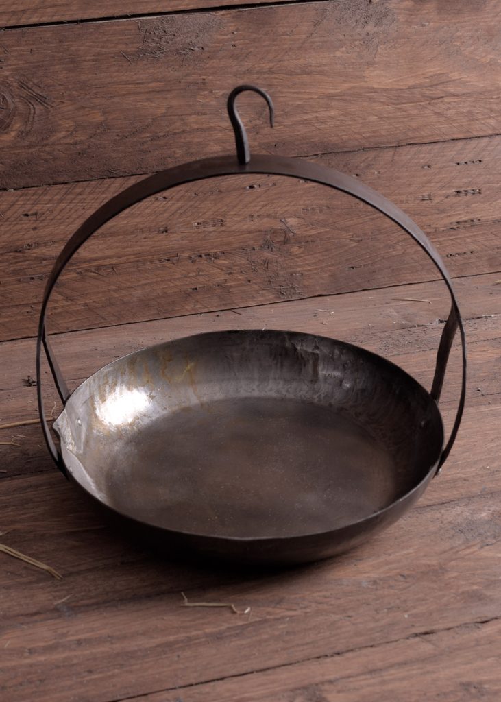 The pan can be hung on a hook or, thanks to its flat shape, placed on a tripod or directly into the fire.