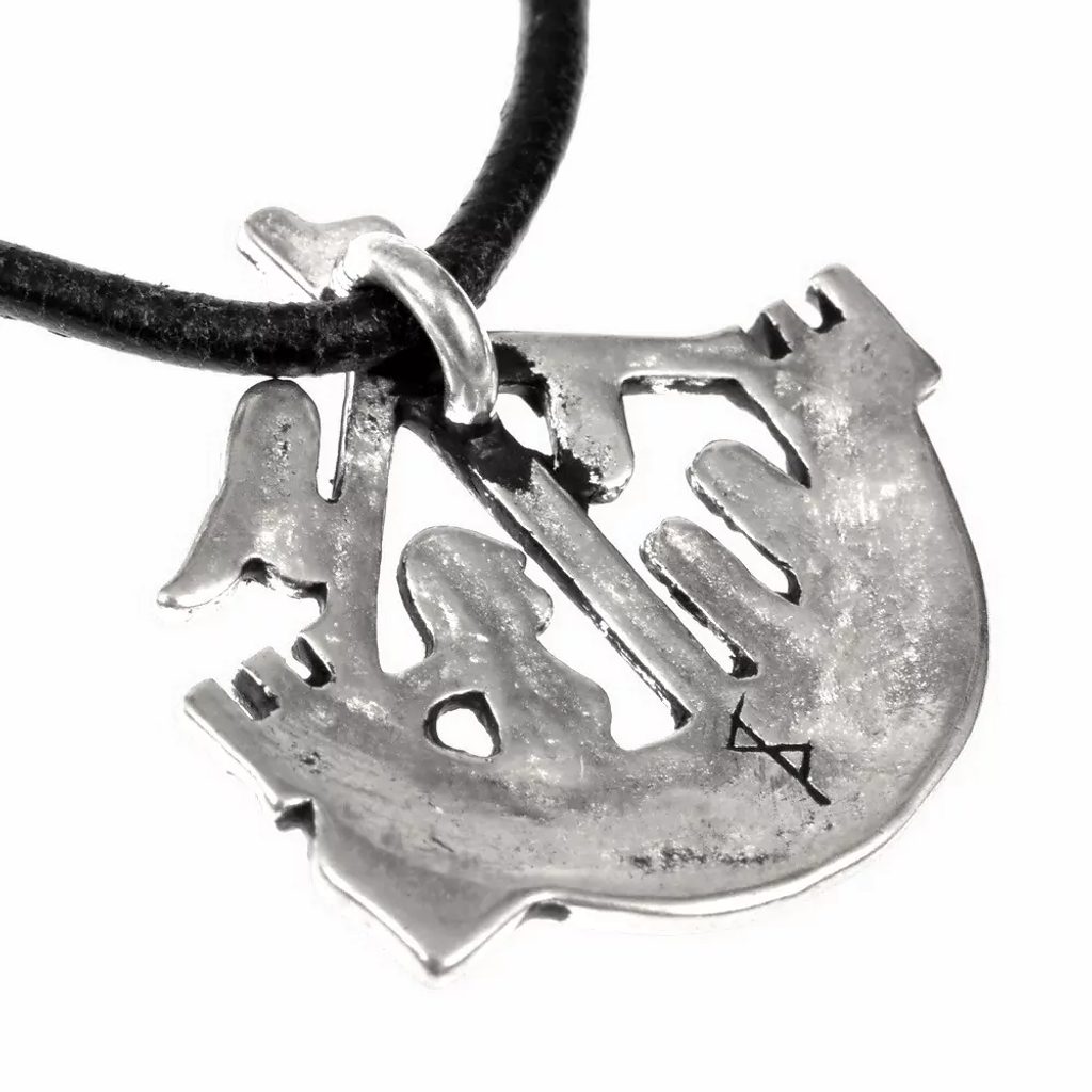 The medieval pendant has an eyelet on the back for attaching to clothing or wearing around the neck as a pendant. The badge can also be easily sewn onto a garment through several holes. A 1 m long black leather strap is included.