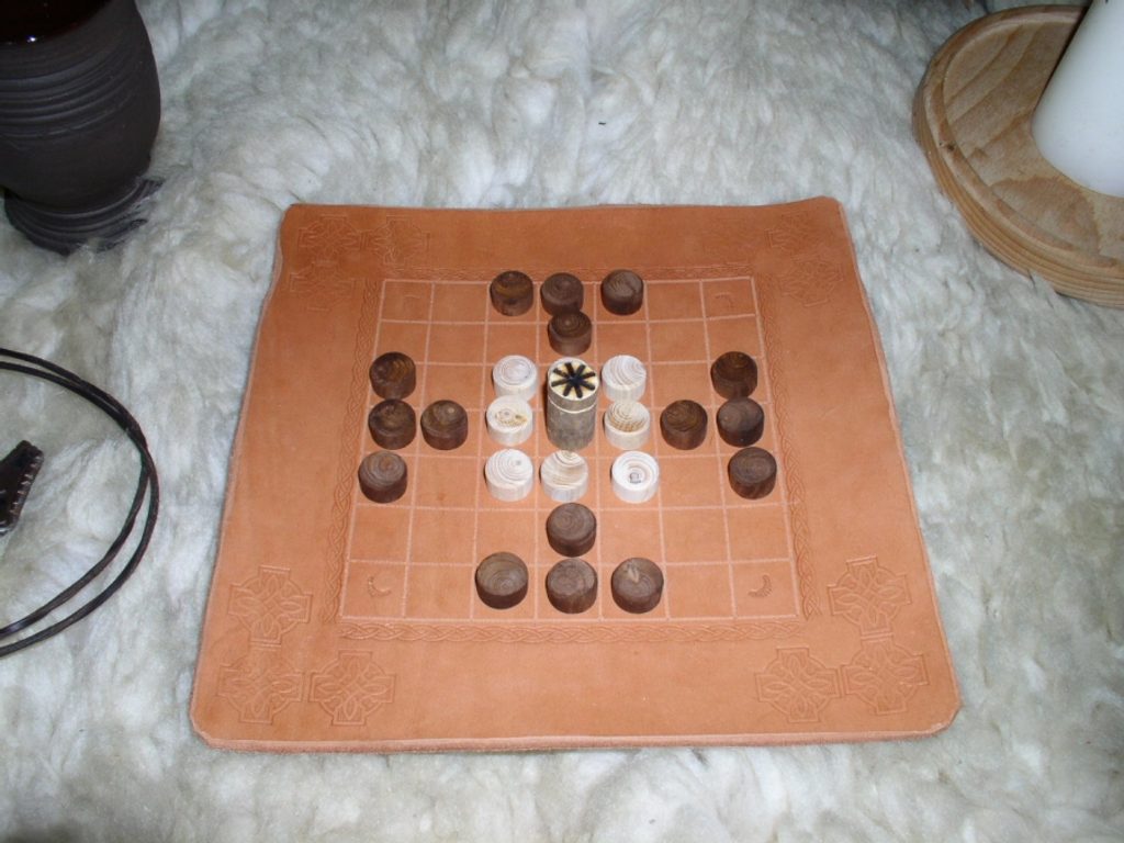 Ard-ri is an ancient Scottish board game for two players. It's name means "the high king". The game simulates a viking raid - four attacking viking drakkars against the Scottish king and his defenders. This game is a smaller travel version of Tafl.