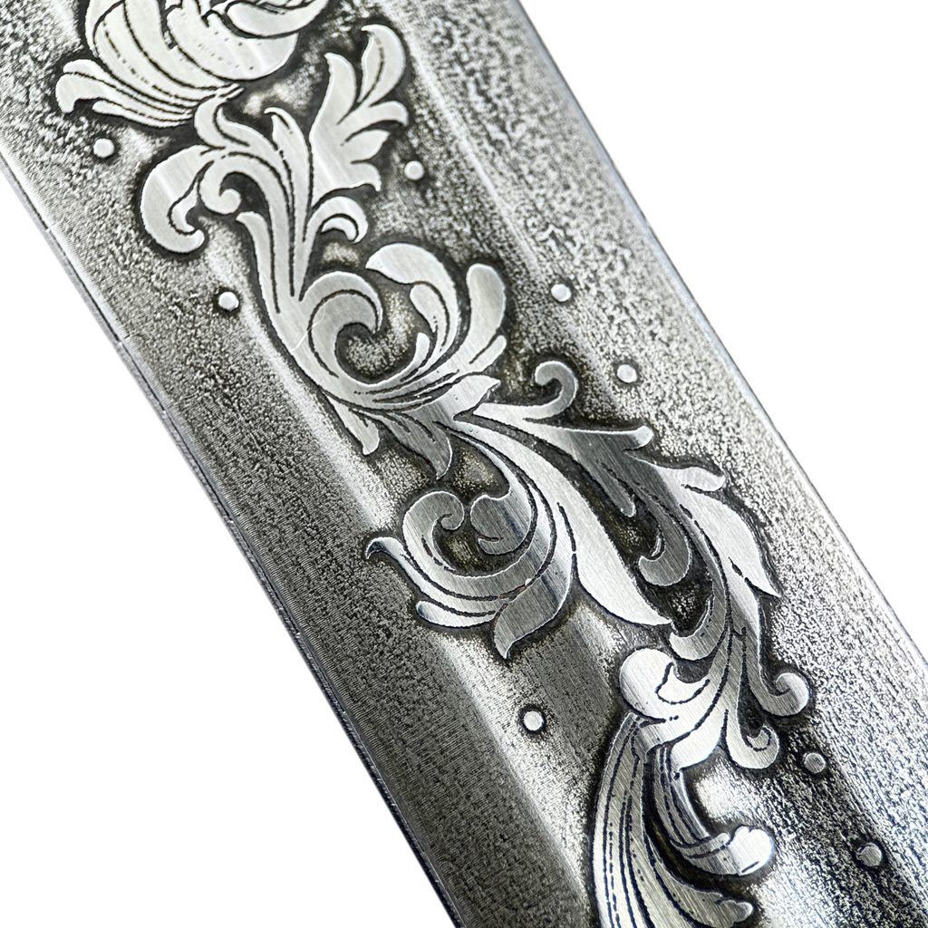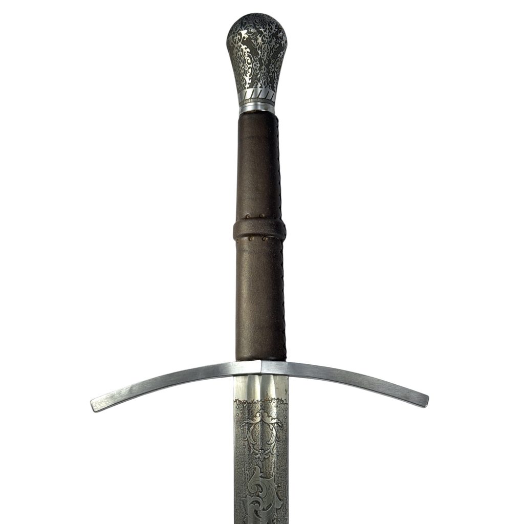 Hand-And-A-Half Sword handmade by Wulflund Smithy, swordsmakers of high quality weapons. The blade is etched.