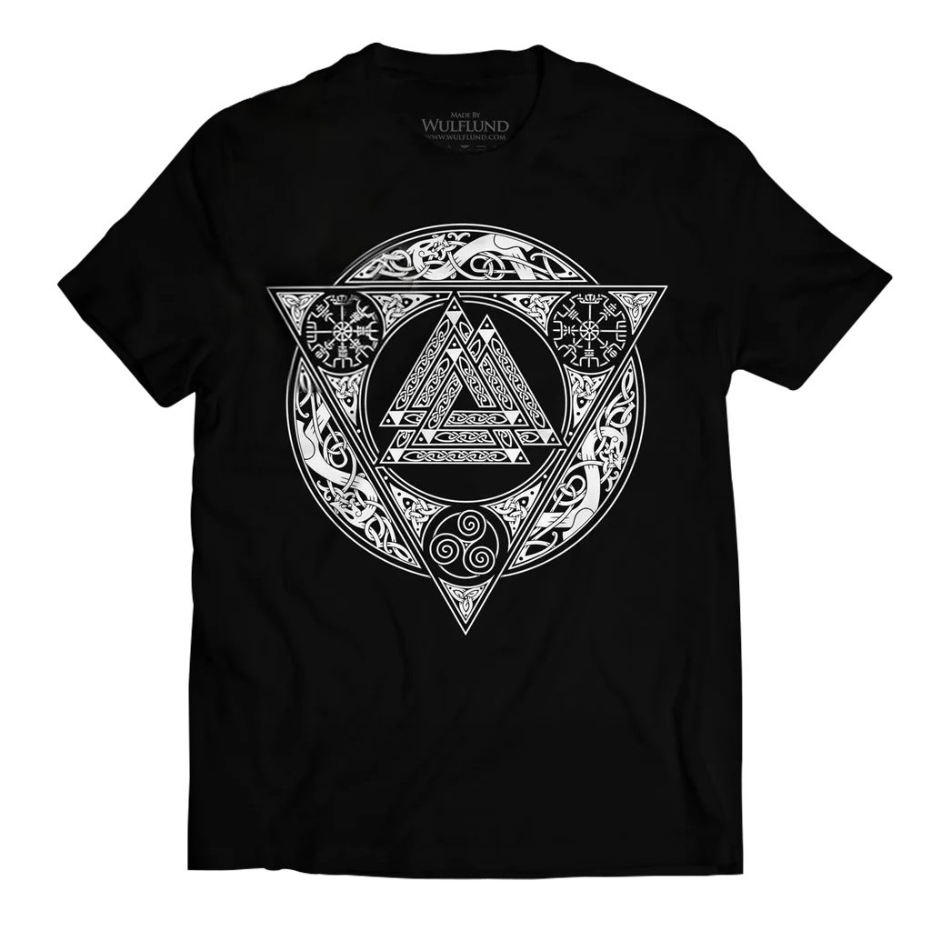 The T-shirt contains old Nordic symbols from Scandinavia - Valknut, Iceland - Vegvísir and Ægishjálmur and Celtic triskel. In short, Nordic magic - to give you strength, protection and a happy return from your travels.