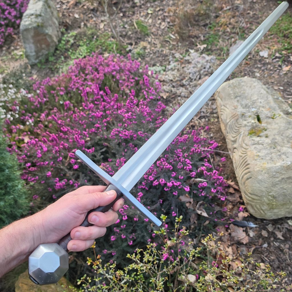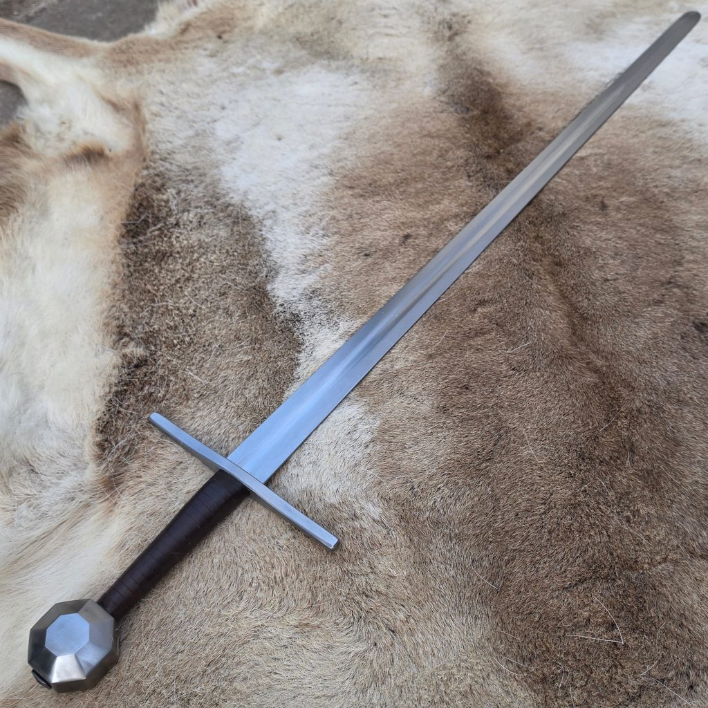 One-handed medieval sword from our forge. Very good design and craftsmanship of the full-tang sword. The entire blade is made in one piece, through the pommel of the sword, where the blade is riveted. In this blunt design the sword is intended for stage fencing.
