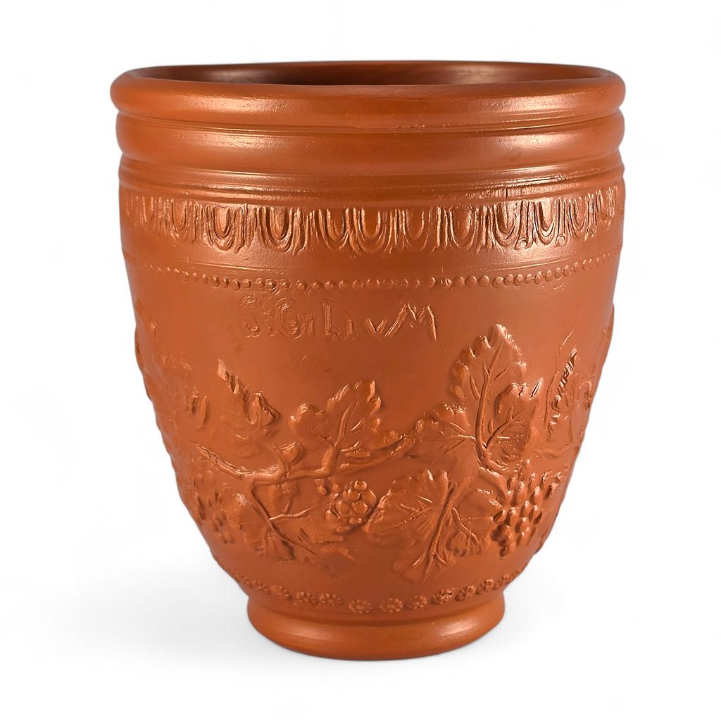 Ceramic goblets were made of fired clay, often with a fine red or dark surface, typical of Roman pottery. The decoration could be pressed into a mould or engraved by hand, allowing for detailed ornamentation. The vine motif was popular throughout the Roman Empire and appeared on both the more luxurious goblets and common tableware.