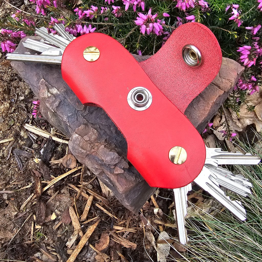 Handmade leather key ring from our saddlery workshop, which is very practical. It can hold up to ten keys. Ergonomic grip that feels comfortable in the hand. There is a thumb hole on one side, which when pushed, slides out the keys from the other side. The key ring is fitted with a saddlery button. Check out our other offer, we make keyrings in different colours and with decoration.