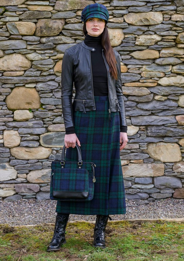 This timeless A line, wrap-around skirt is 100% wool and easy to wear.