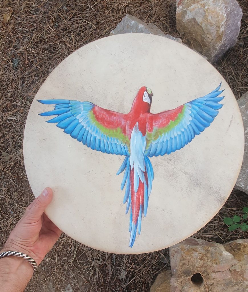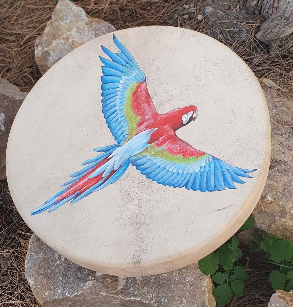 Handpainted Shamanic Frame Drum. High quality deerhide on spruce frame lends this drum a great sound. You can order a textile case and a beater.