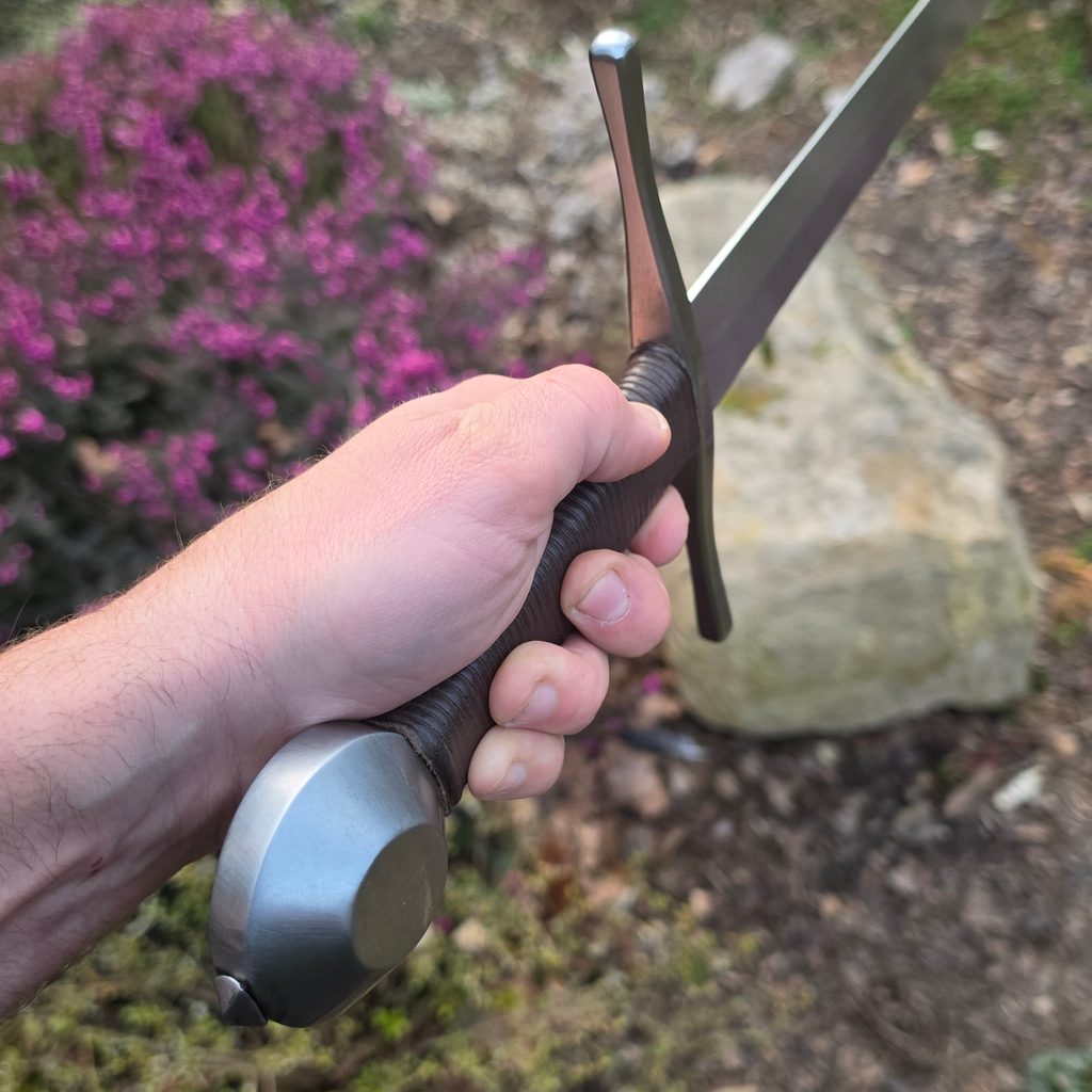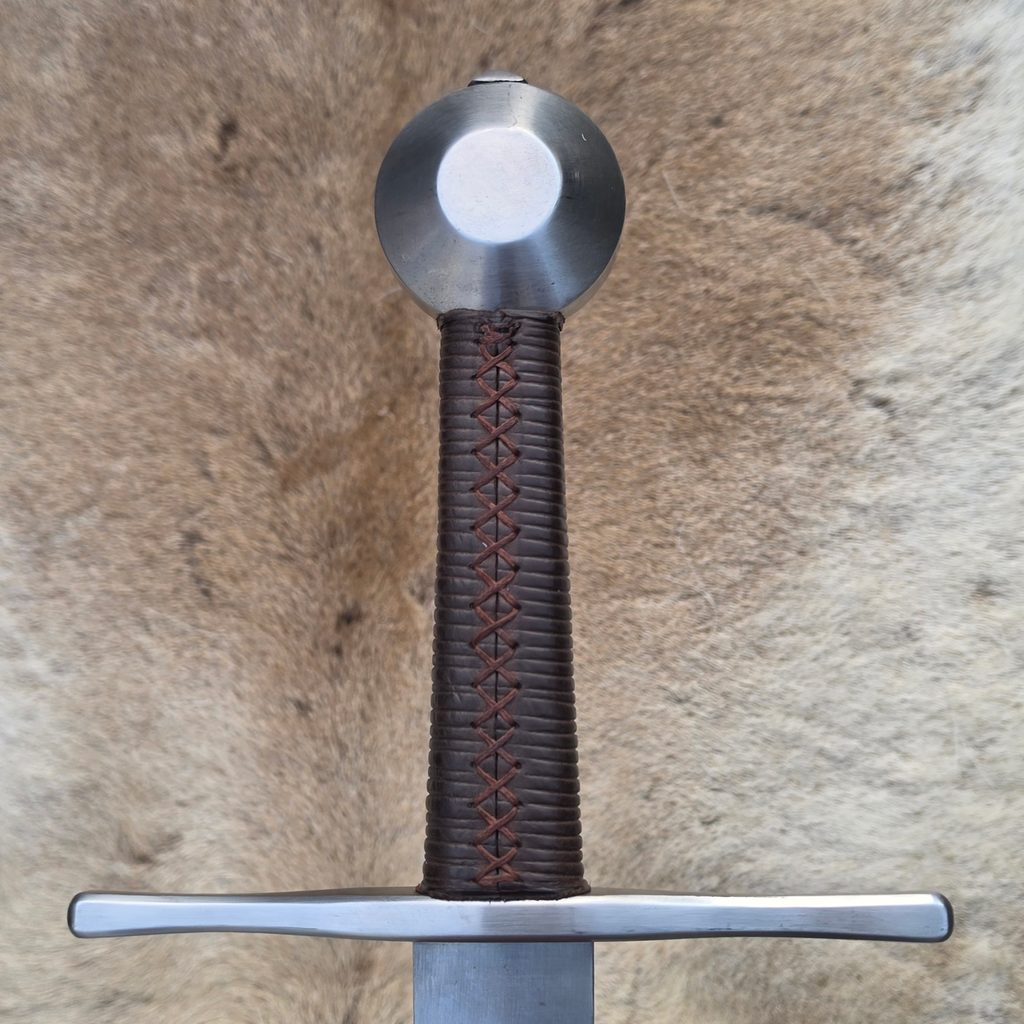 One-handed medieval sword from our forge. Very good design and craftsmanship of the full-tang sword. The entire blade is made in one piece, through the pommel of the sword, where the blade is riveted. In this blunt design the sword is intended for stage fencing.