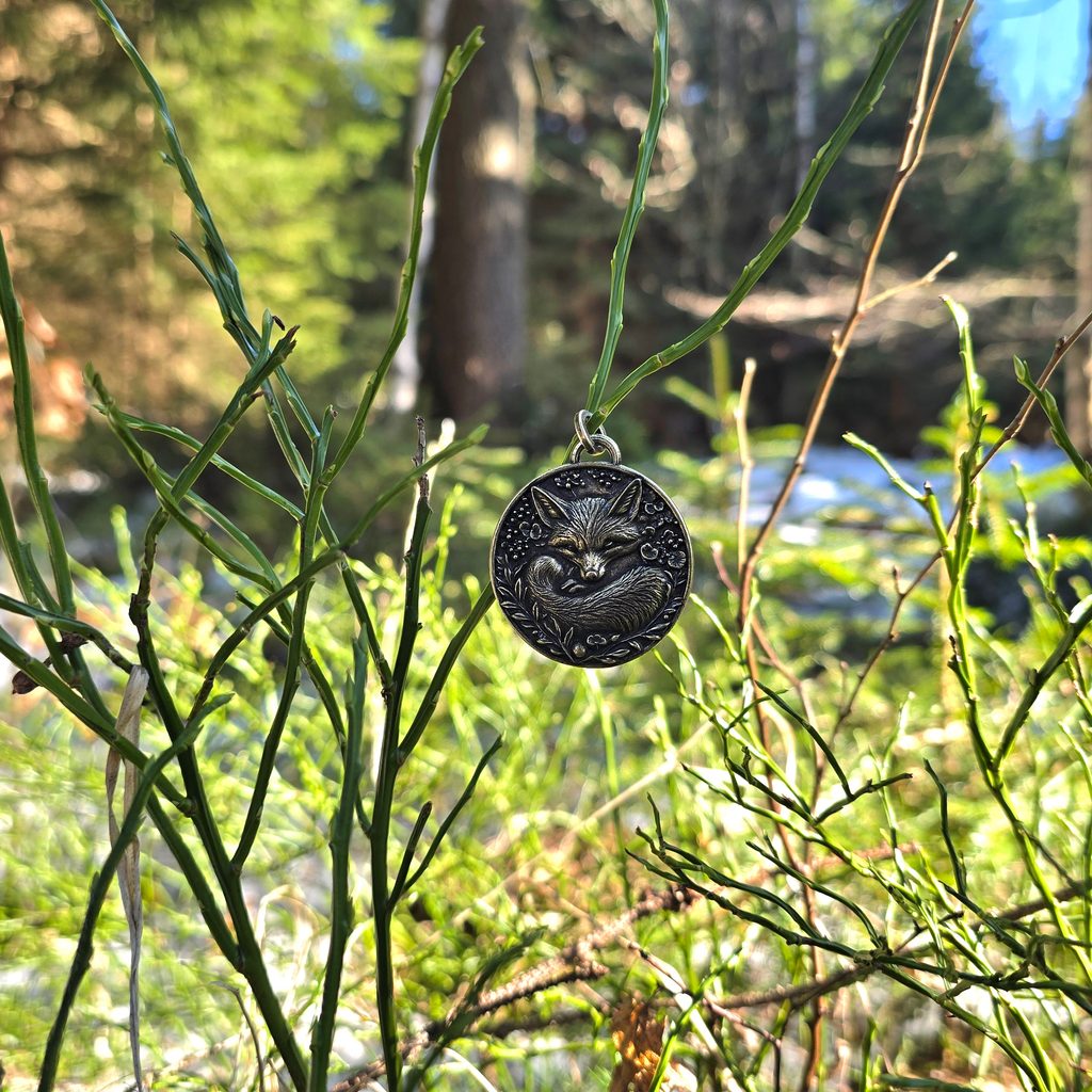Cute big medallion with sleeping fox in moss and ferns. Look at her resting peacefully, hidden in the safety of the forest undergrowth. The jewel exudes peace, gentleness and tranquility, reminiscent of the silence of the forest and the slow passage of time in nature. Thanks to its gentle motif, it will delight the smallest animal lovers and adults who feel a connection with nature and its mysteries. The medallion can symbolize rest, protection and a return to inner balance, and will become a beautiful personal talisman for every day.