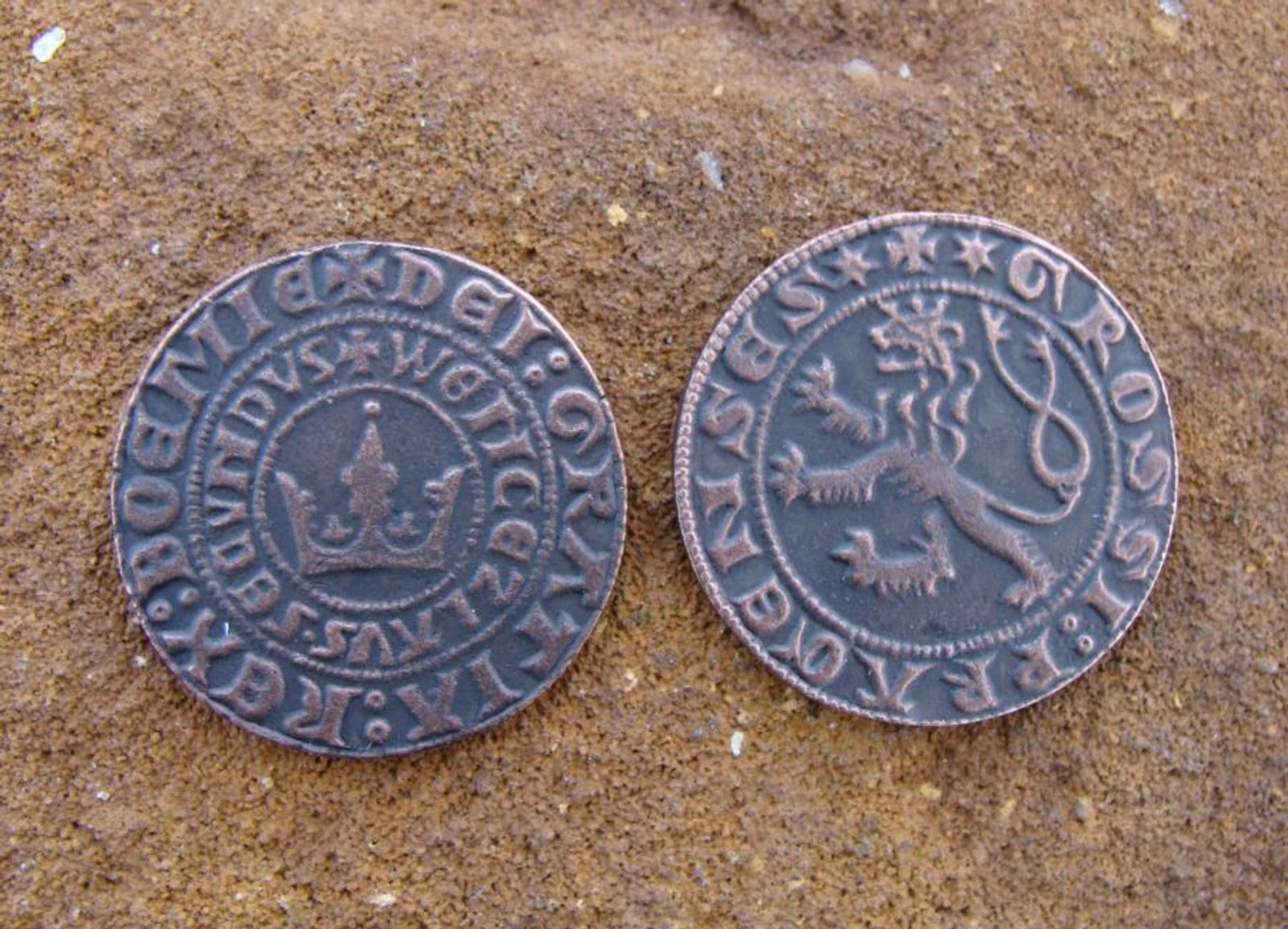 The Prague groschen was a silver coin that was very common throughout the Medieval Central Europe. Minting of Prague Groshen coins started around 1300 after rich silver mines had been discovered in the Kutna Hora region during the reign of the Bohemian king Wenceslas II. Because of high amount of silver in the coin it became one of the most popular of the Groschen-type coins in the medieval Europe. Size: cca 3 cm. Price is for one piece.