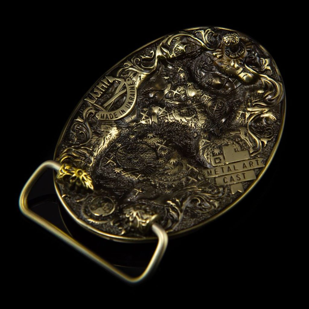 The buckle is cast in brass. After casting, each buckle is worked by hand. It is then patinated and re-polished. The buckle is supplied with a brass frame in two sizes (38 mm and 45 mm) for subsequent attachment to the belt.