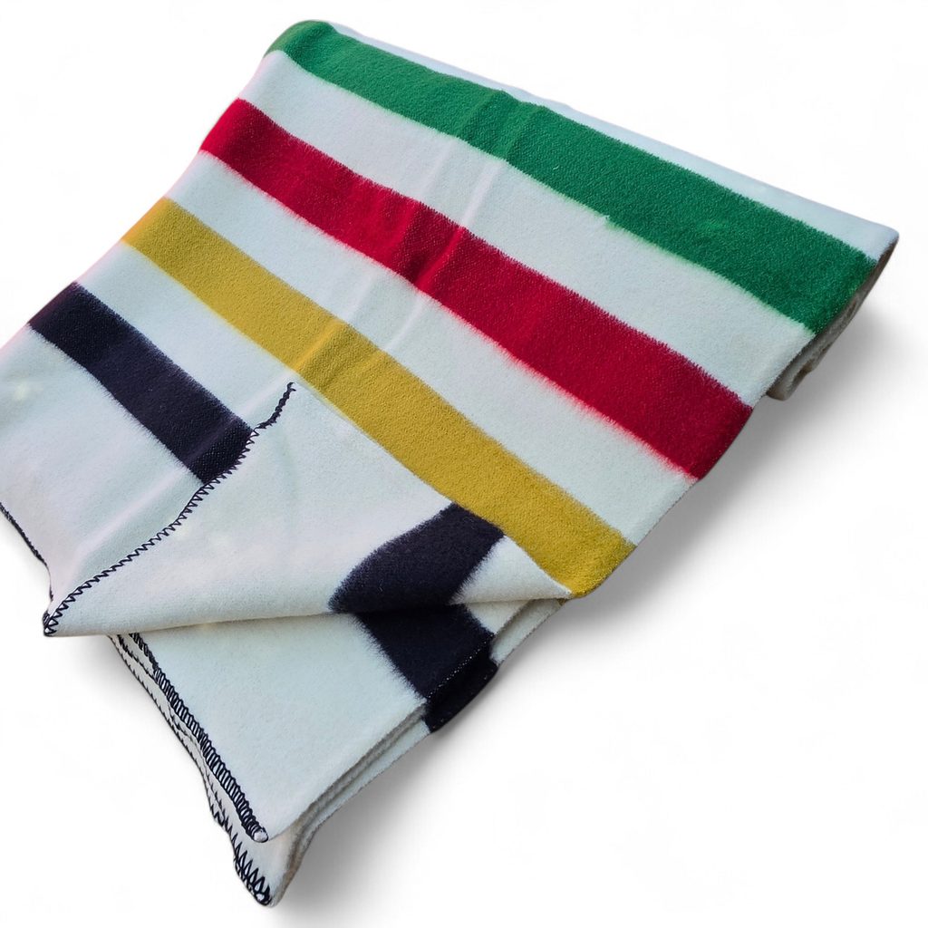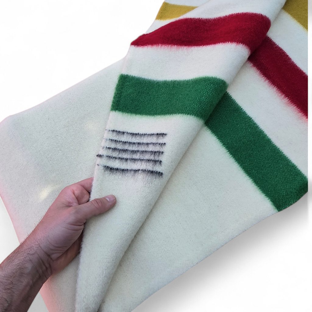 Rainbow is now considered one of the most iconic wool blankets inspired by the fur trade era in North America. Its look is a nod to the famous multi-stripe "point blankets" that were traded primarily by the Hudson's Bay Company from the 18th century onward. These blankets were made of tightly woven wool, were extremely warm and durable, and often served not only as a blanket but also as a full-fledged substitute for sleeping bags or as material for making capote-type coats.