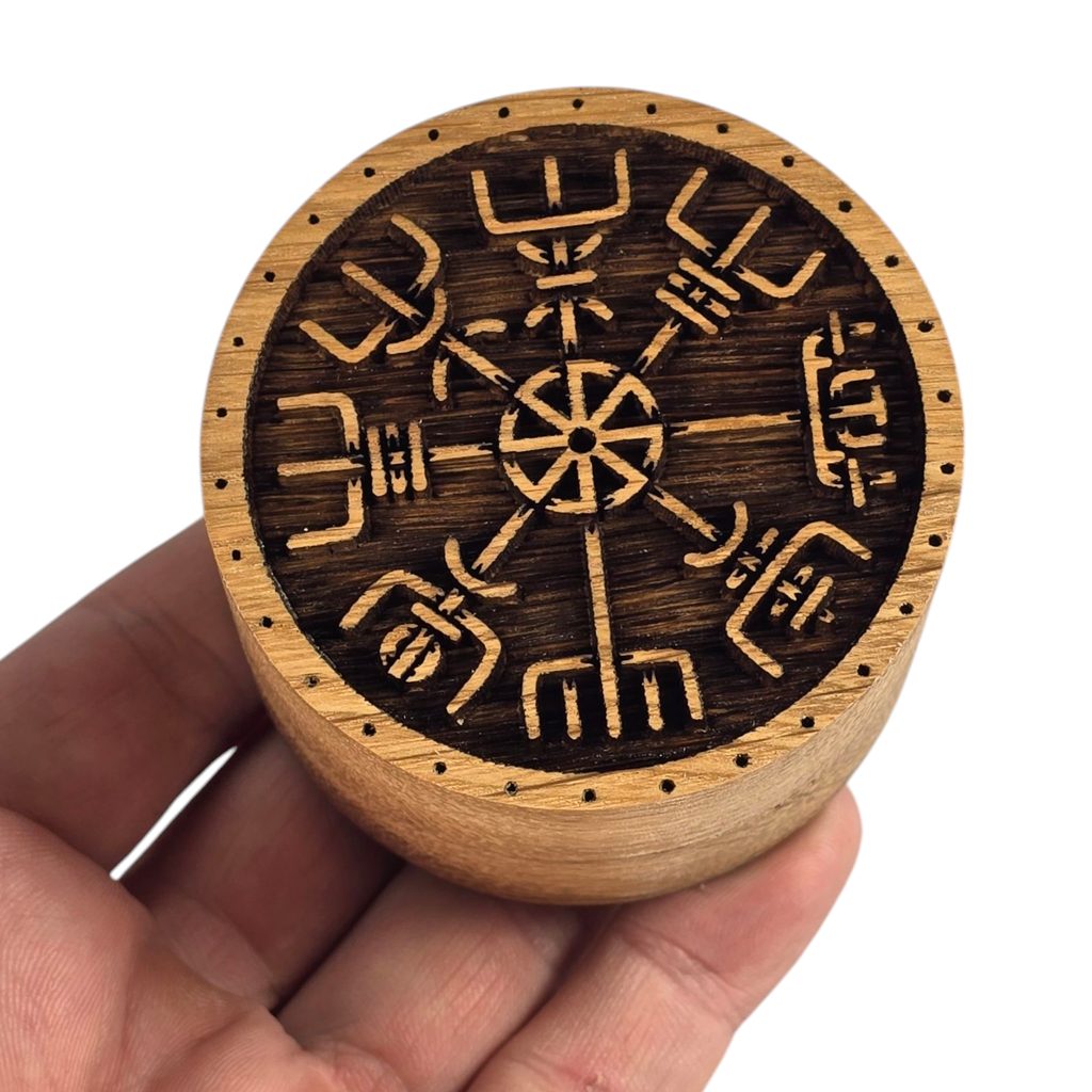 Very original oak jewellery box with burnt symbol. With foam filling and magnets.