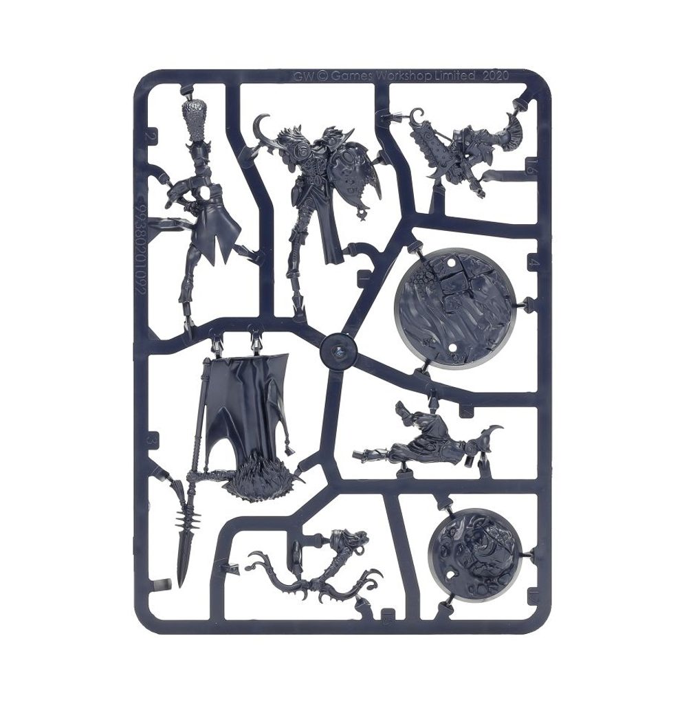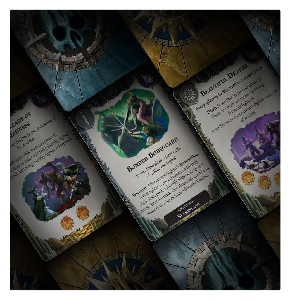 – The complete Dread Pageant warband – a group of depraved Hedonites of Slaanesh tormenting the living mountain. Build your warband with the four push fit plastic models, cast in coloured plastic, and build your decks with fighter cards and a number of warband-specific cards that let you harness their power of excess in battle.