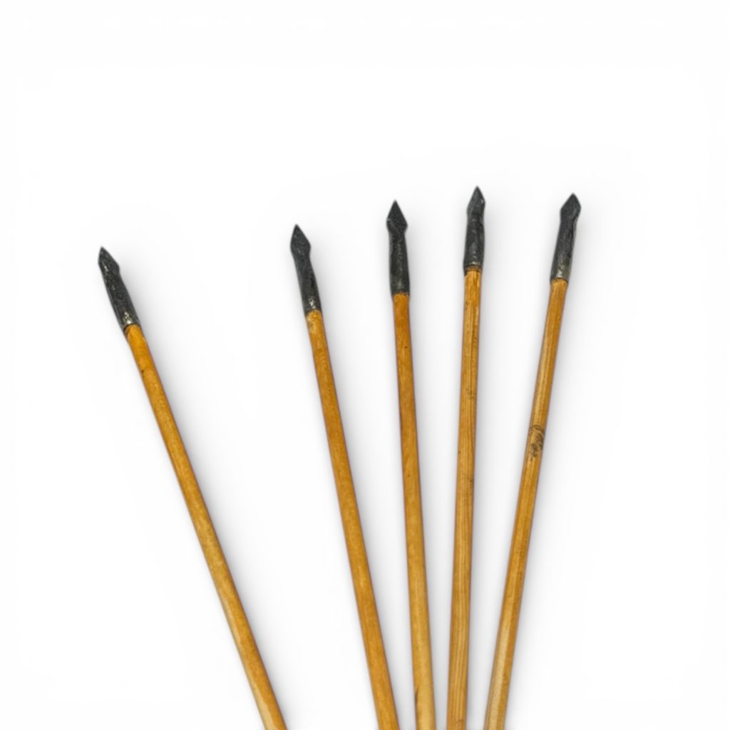 The wooden rod is approximately 75 cm long, or longer by agreement. The goose feather quills are strong and hold the flight well. The broadhead is target tipped, making it suitable for regular target and practice use.