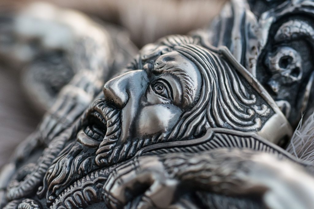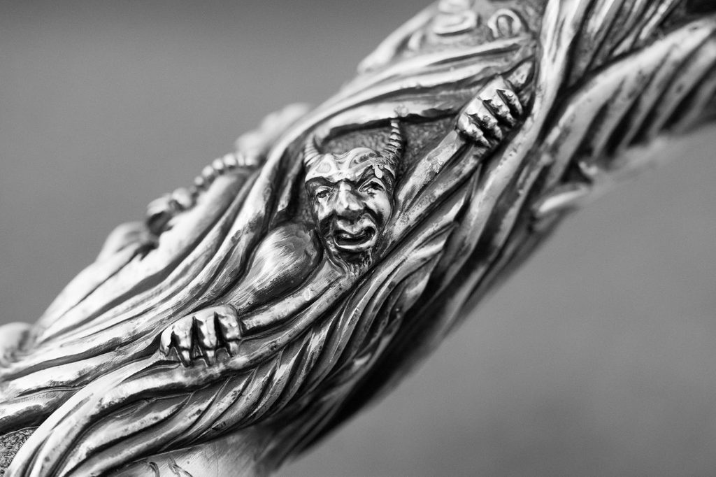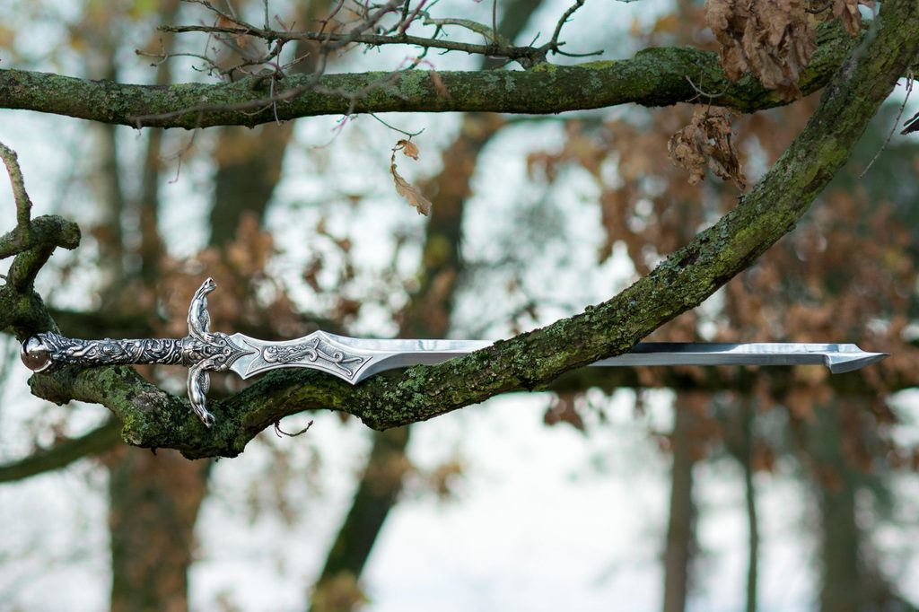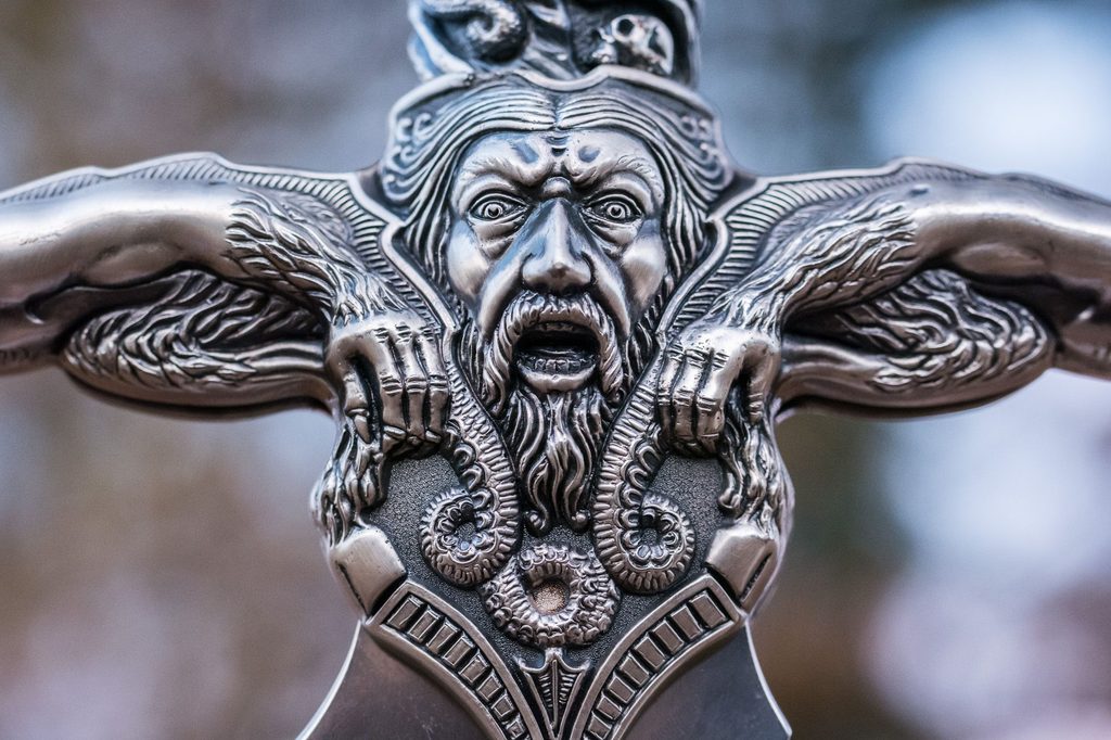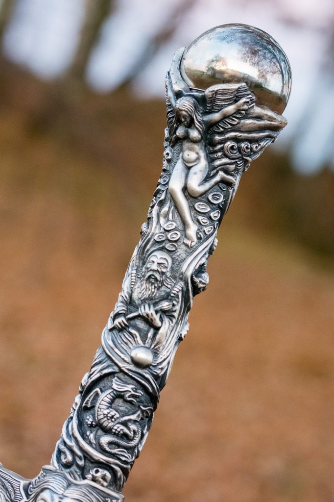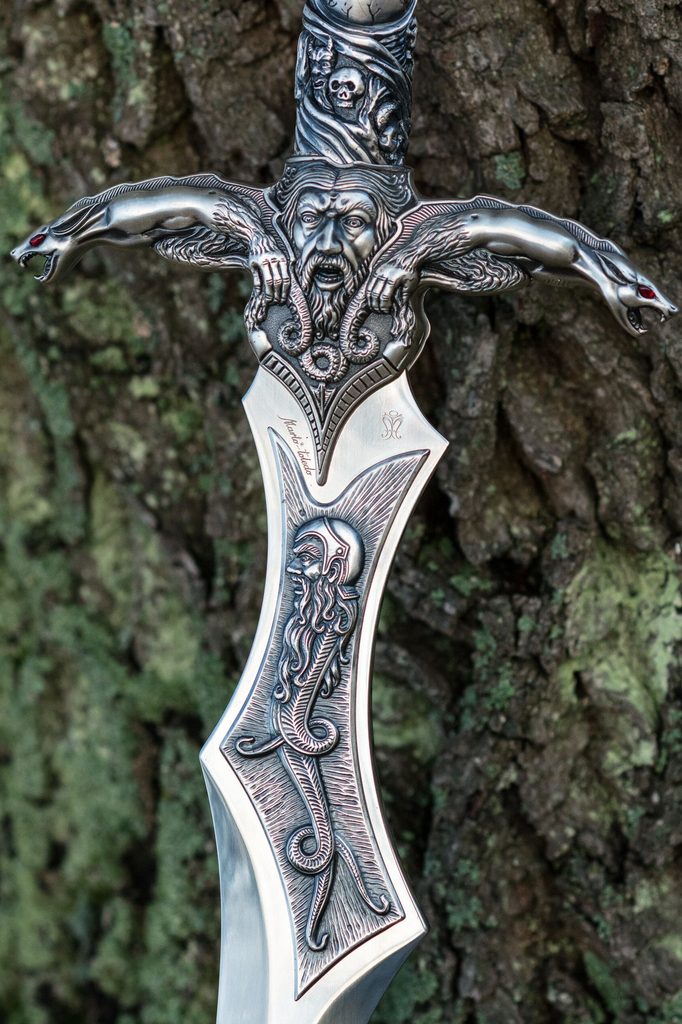 Fantasy Merlin the Magician Sword by Marto of Toledo, Spain with a very particular shaped tempered steel blade. The upper part is ornamented with a metal plaque depicting the wizard's head on a wyrm body.