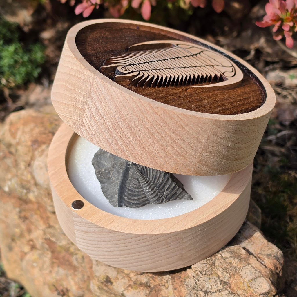 The box is designed for those who bring back small treasures from their trips - be it trilobites, ammonites or other fossils. The box is designed so that you can not only store your haul safely, but also display it nicely.